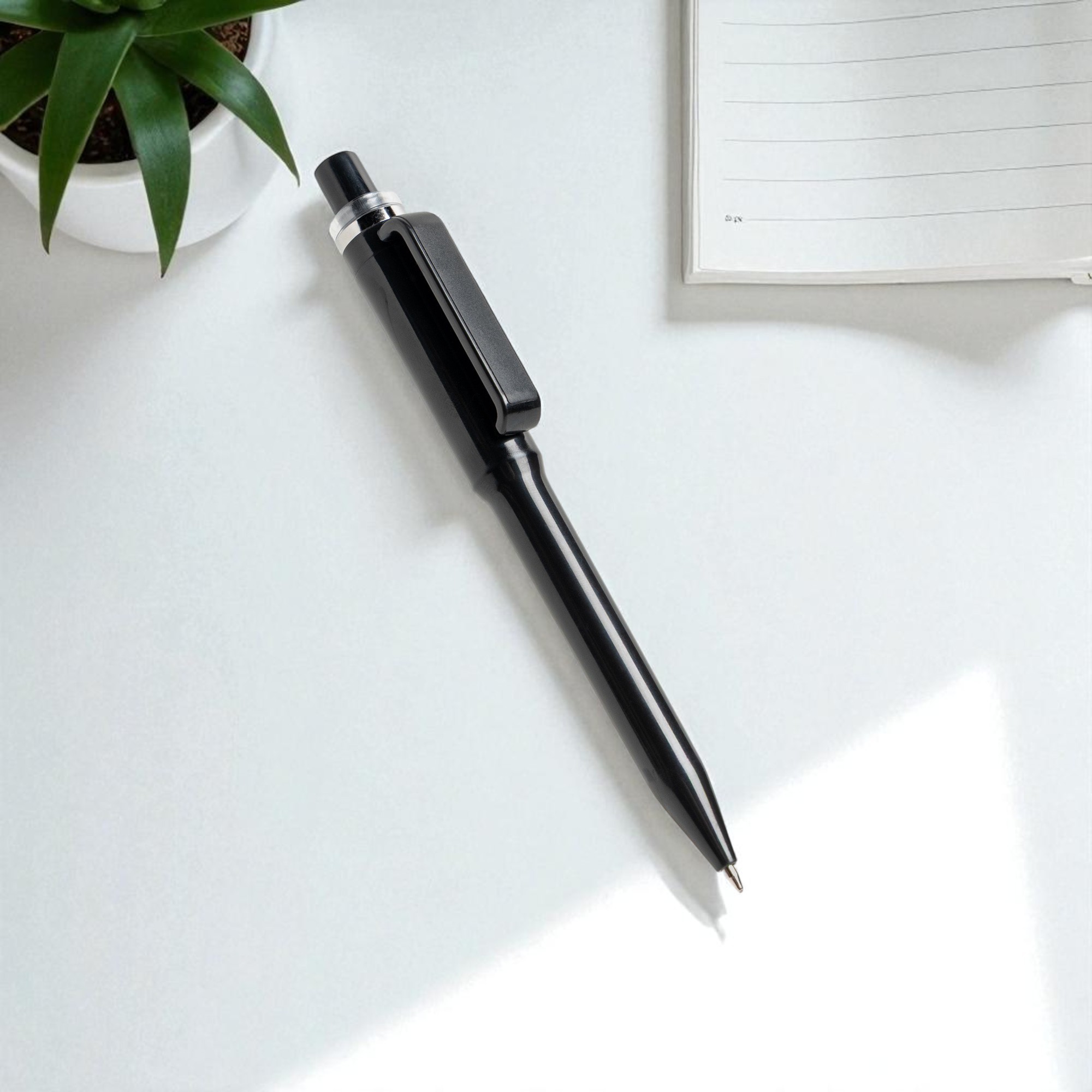 Długopis wykonany z recyklingowanego plastiku ABS, o nowoczesnym designie inspirowanym naczyniami do napojów. Wyposażony w mechanizm przyciskowy, zapewnia płynne pisanie niebieskim tuszem. Dostępny w różnych kolorach, stanowi zrównoważony i stylowy wybór na co dzień