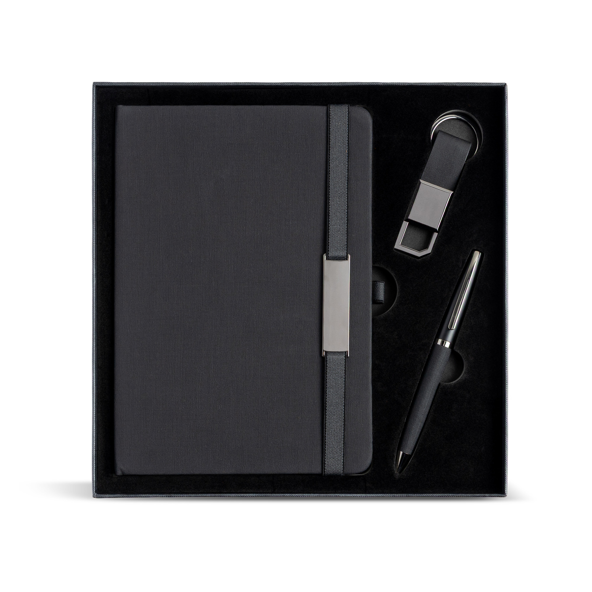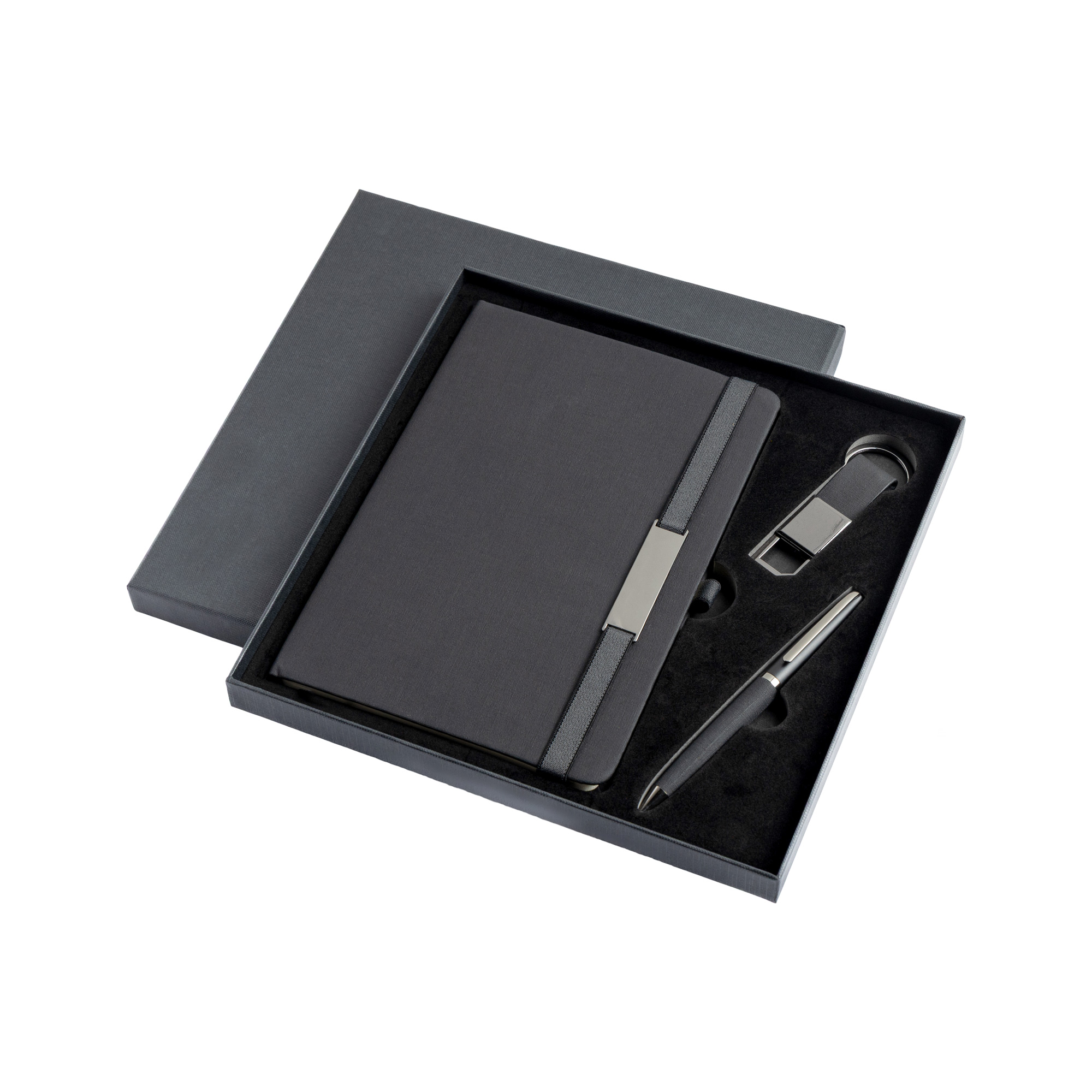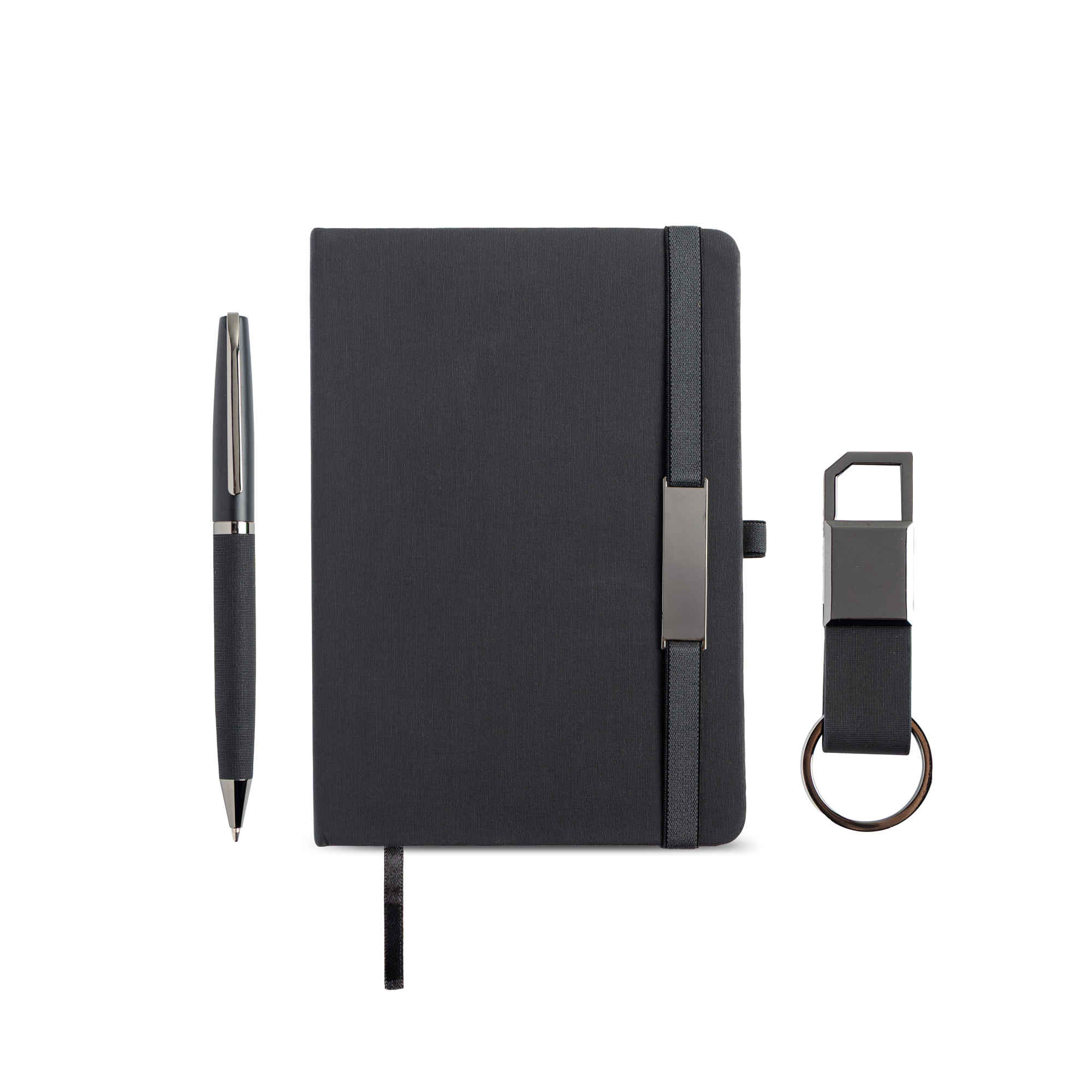 Elegancki zestaw składający się z trzech harmonijnie dopasowanych elementów. Zawiera notes A5 w twardej oprawie pokrytej tkaniną PU, z elastyczną tasiemką ozdobioną lustrzanym metalowym detalem oraz dopasowaną wstążką – zakładką. Notes ma 160 stron w linie, idealnych na notatki, szkice czy codzienne zapiski. Towarzyszy mu czarny, lustrzany metalowy długopis kulkowy z korpusem z PU, piszący czarnym tuszem. W zestawie znajduje się także brelok z PU z czarnym, lustrzanym metalowym kółkiem. Całość zaprezentowana jest w wyrafinowanym czarnym pudełku upominkowym, owiniętym białą obwolutą, co czyni go doskonałym wyborem na prezenty firmowe, specjalne okazje czy pamiątkowe upominki.