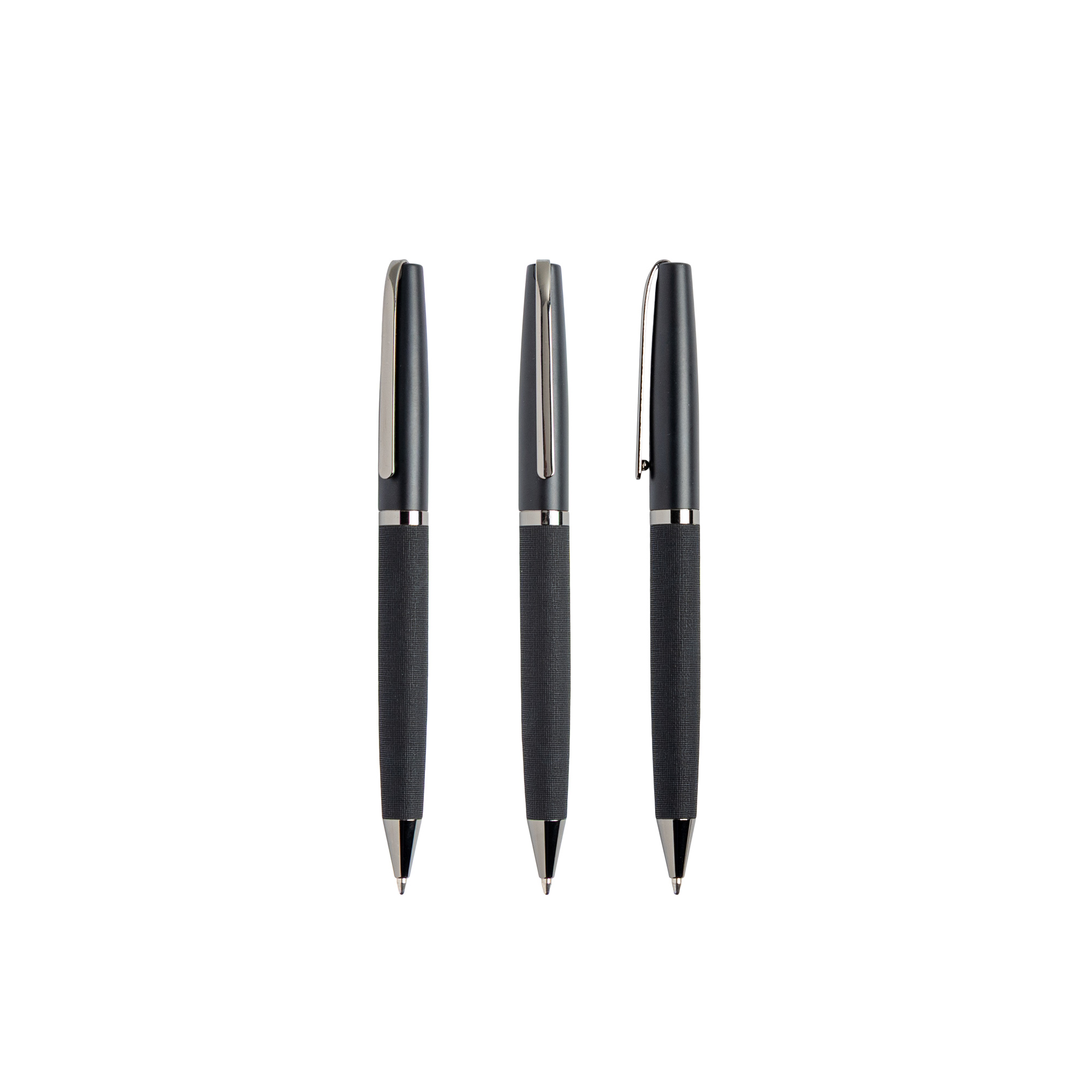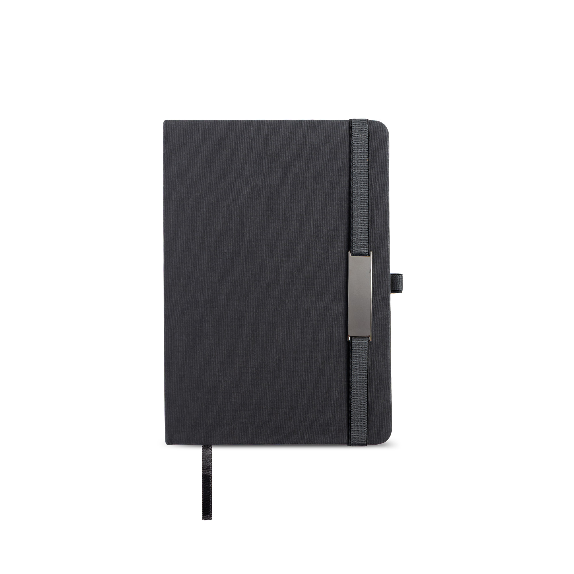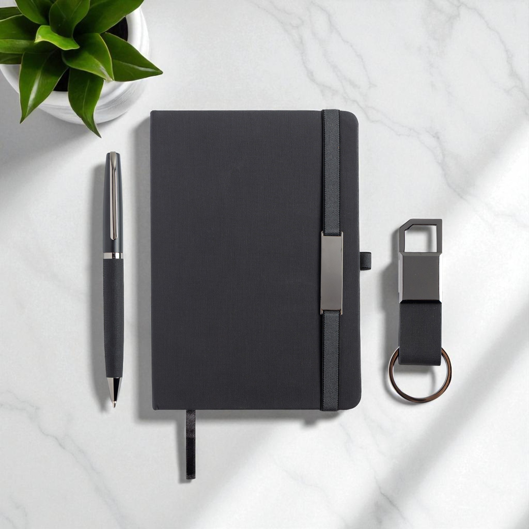 Elegancki zestaw składający się z trzech harmonijnie dopasowanych elementów. Zawiera notes A5 w twardej oprawie pokrytej tkaniną PU, z elastyczną tasiemką ozdobioną lustrzanym metalowym detalem oraz dopasowaną wstążką – zakładką. Notes ma 160 stron w linie, idealnych na notatki, szkice czy codzienne zapiski. Towarzyszy mu czarny, lustrzany metalowy długopis kulkowy z korpusem z PU, piszący czarnym tuszem. W zestawie znajduje się także brelok z PU z czarnym, lustrzanym metalowym kółkiem. Całość zaprezentowana jest w wyrafinowanym czarnym pudełku upominkowym, owiniętym białą obwolutą, co czyni go doskonałym wyborem na prezenty firmowe, specjalne okazje czy pamiątkowe upominki.