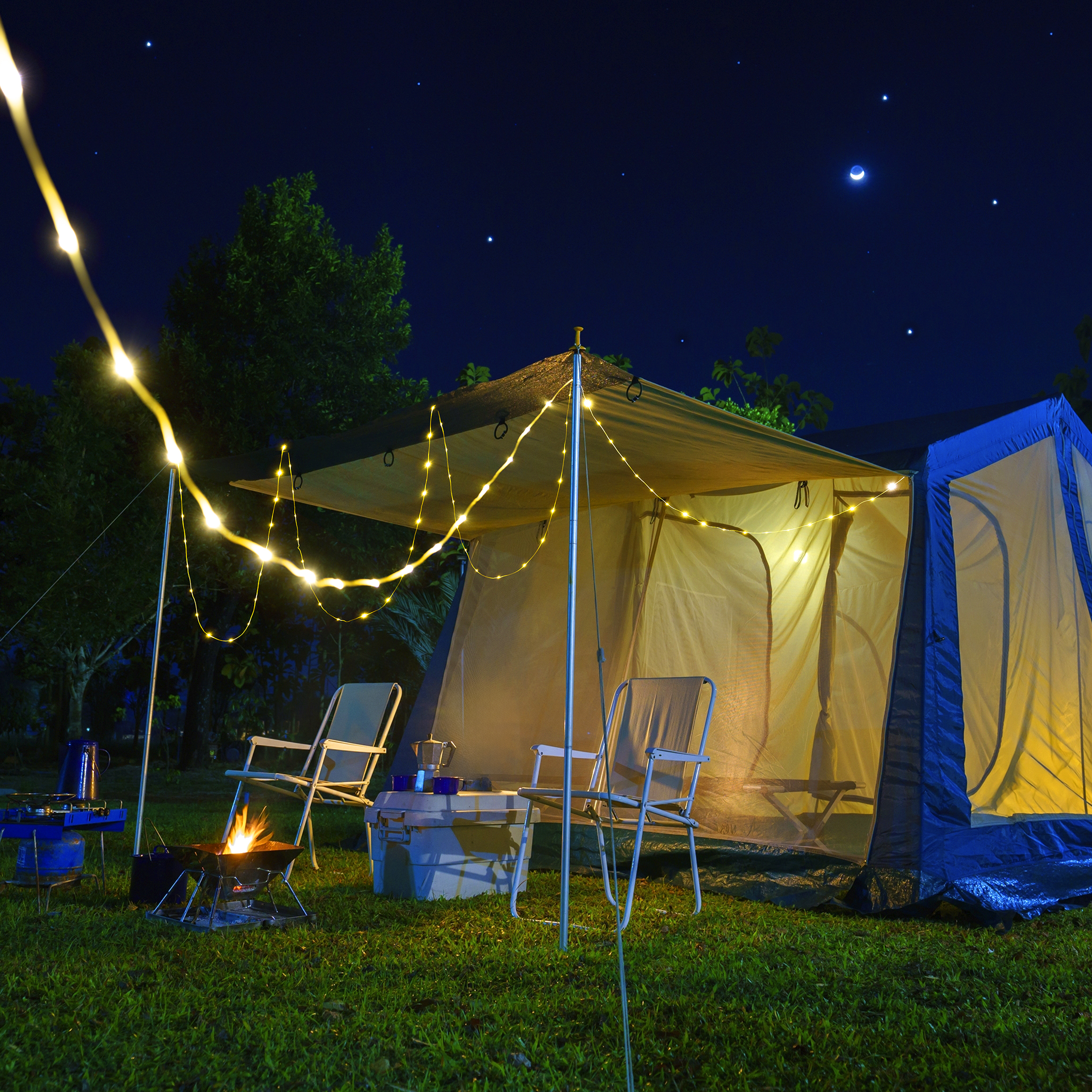 Lampka kempingowa z trzema trybami świecenia: słabym, mocnym i czerwonym migającym. Lampa zawiera 24 białe i 12 czerwonych diod LED. Ma wbudowany 10-metrowy kabel świetlny, który można wykorzystać do ozdobienia namiotu podczas biwakowania. Wodoodporność: IPX4. Jasność: 80–250 lumenów.