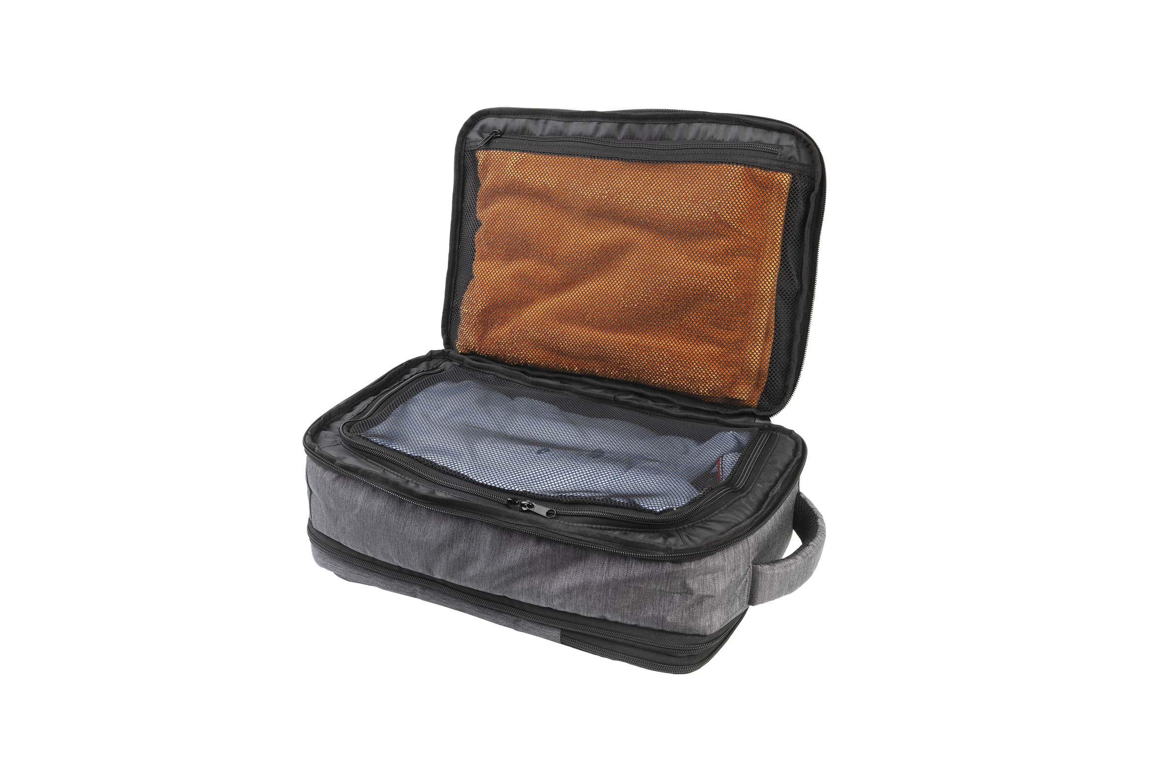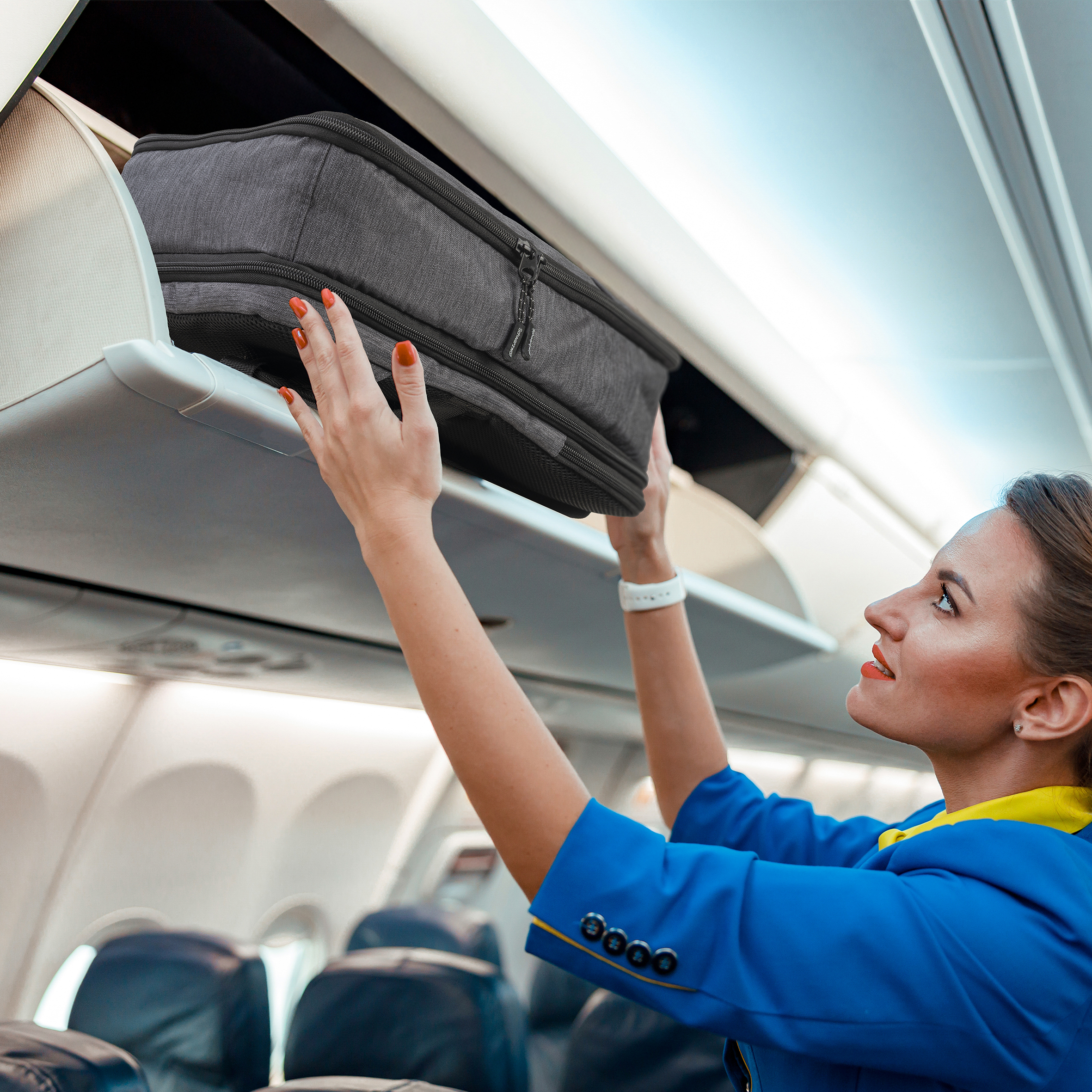 Szary plecak podróżny, wyróżniający się konstrukcją przypominającą walizkę podróżną, nadaje się jako bagaż podręczny do samolotu. Wewnątrz znajduje się komora z dużą kieszenią z siatki zapinaną na zamek oraz dodatkową kieszenią z siatki na zamek. Na zewnątrz plecak posiada przednią kieszeń na zamek, tylną kieszeń na laptopa zapinaną na zamek, rozszerzany zamek zwiększający pojemność plecaka oraz pasek. Plecak ma wyściełany system nośny i szelki na ramiona. Wyposażony jest także w uchwyt do przenoszenia.
