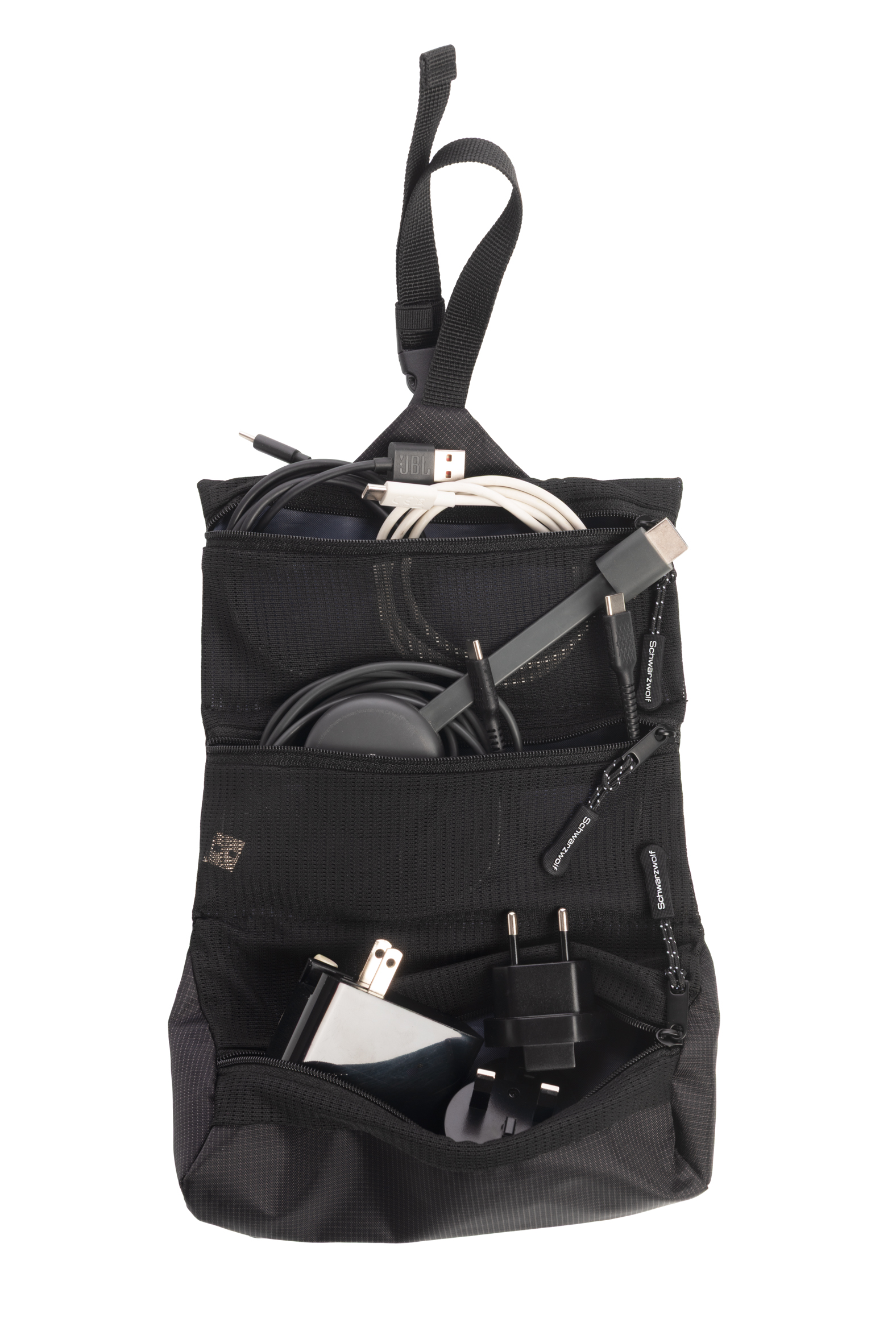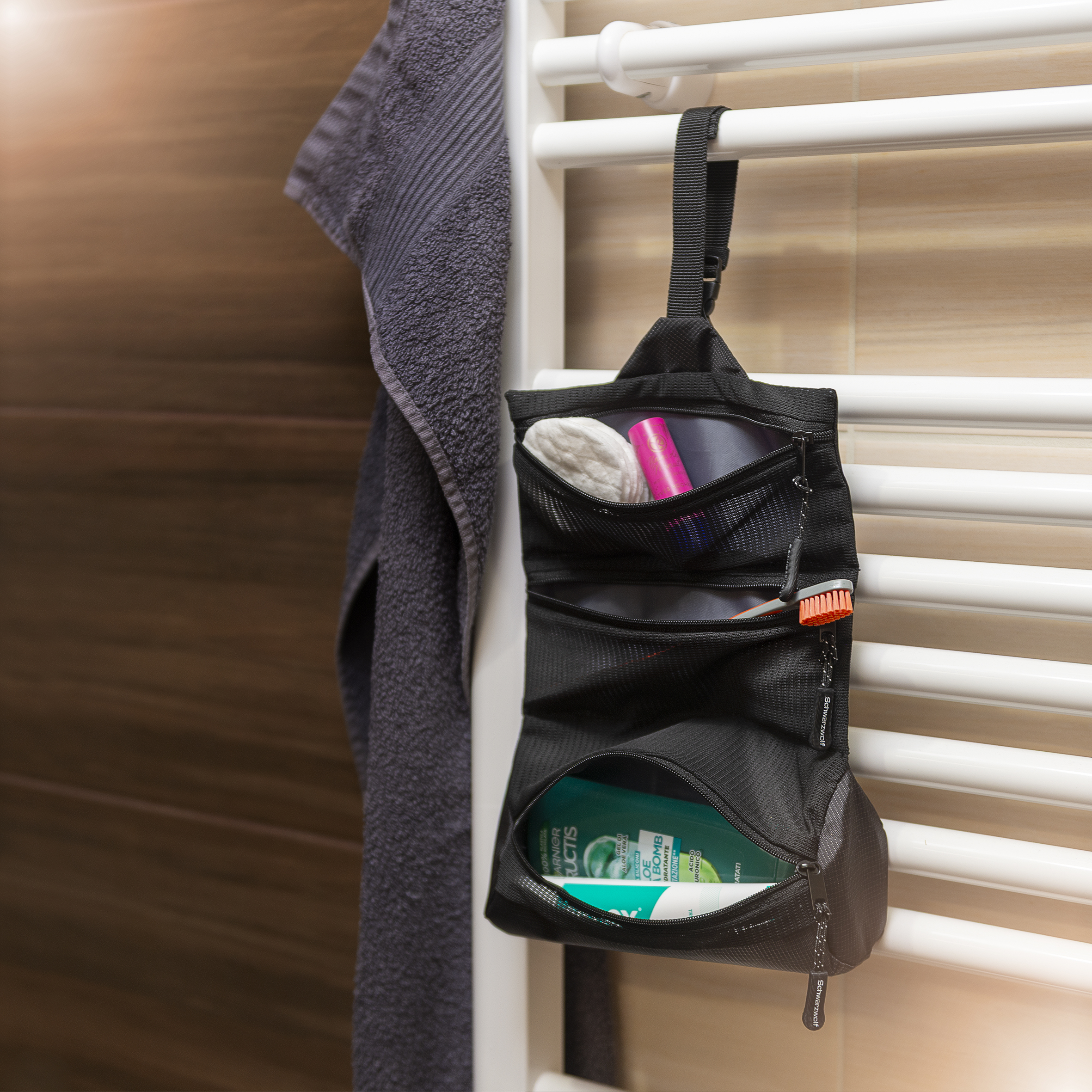 Praktyczna, wielofunkcyjna torba na kosmetyki i drobne przedmioty w kolorze czarnym, idealna do wygodnego podróżowania. Posiada 3 kieszenie z siatki zapinane na zamek. Wyposażona jest w klamrę, której można użyć do zamknięcia zwiniętej torby lub do stworzenia pętli do zawieszenia torby.