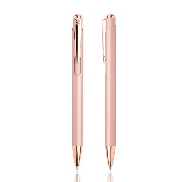 Zachwycający metalowy długopis w nowoczesnym stylu glamour. Dostępny w bogatej gamie kolorystycznej. Długopis charakteryzuje się powierzchnią soft touch, posiada zdobienia w złotym odcieniu oraz załączony niebieski wkład piszący. Idealny do laserowego grawerowania – otrzymujemy w ten sposób błyszczące znakowanie