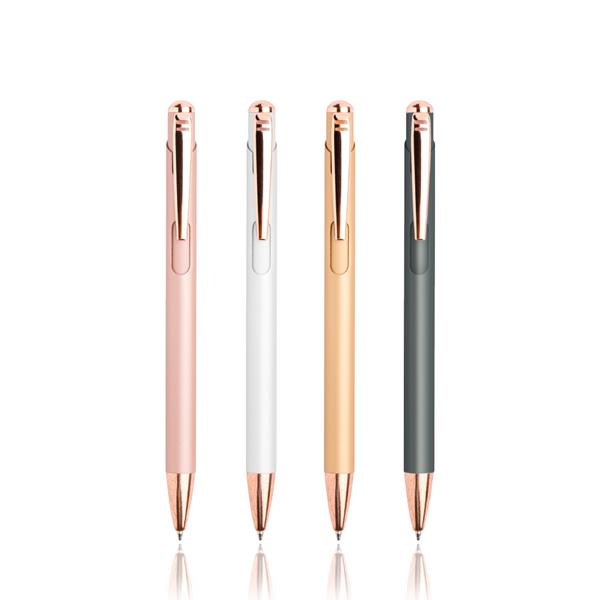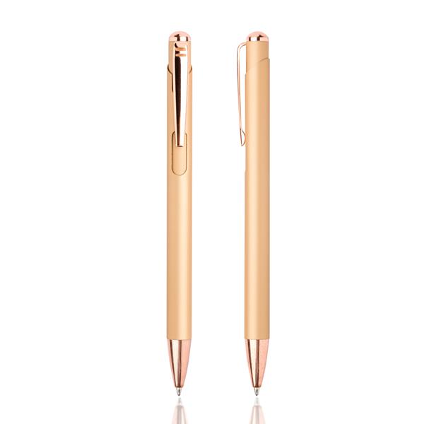 Zachwycający metalowy długopis w nowoczesnym stylu glamour. Dostępny w bogatej gamie kolorystycznej. Długopis charakteryzuje się powierzchnią soft touch, posiada zdobienia w złotym odcieniu oraz załączony niebieski wkład piszący. Idealny do laserowego grawerowania – otrzymujemy w ten sposób błyszczące znakowanie