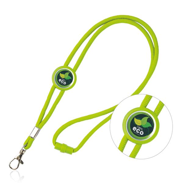 Regulowana smycz wykonana z poliestru, posiada karabińczyk. Długość smyczy - około 85 cm. Logo umieścimy w kółku o średnicy 2,6 cm.