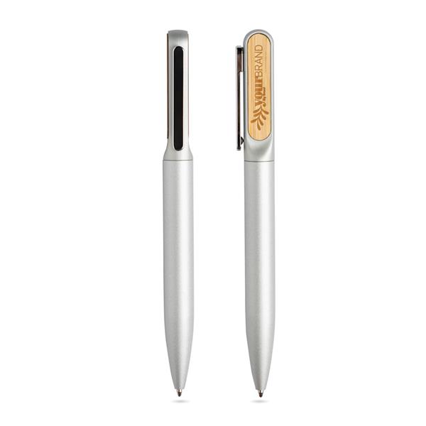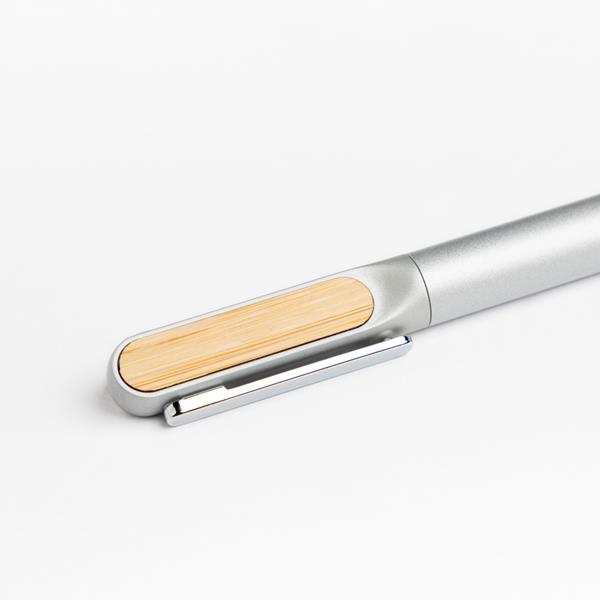 Elegancki metalowy długopis z dwoma bambusowymi elementami, które idealnie nadają się do znakowania laserowego.