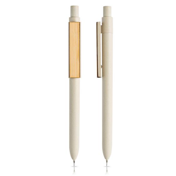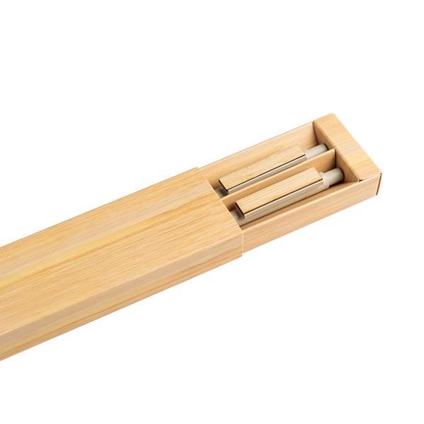 Zestaw: długopis i ołówek mechaniczny z włókna bambusowego, etui prezentowe. Łącząc ekologię z elegancją zestawu do pisania, powstał ten nowy produkt. Długopis i ołówek mechaniczny wykonane są z włókna bambusowego i PP. Bambusowym klips zapewnia dobrą powierzchnią do grawerowania. Długopis pisze na niebiesko. Oba produkty do pisania działają w systemie push. Zawiera kartonowe etui, format wysuwanego rękawa.
