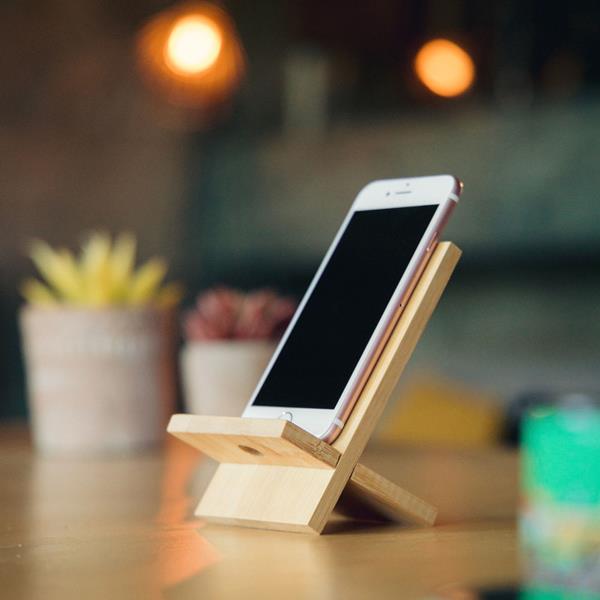 Wykonany z naturalnych materiałów stojak na telefon ze specjalnym otworem, dzięki któremu można wygodnie poprowadzić kabel i ładować telefon w pozycji pionowej.