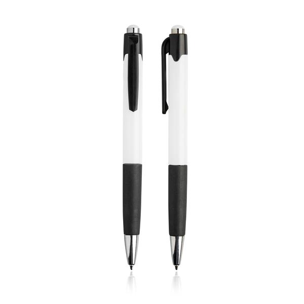 Plastikowy długopis z gumowanym uchwytem.