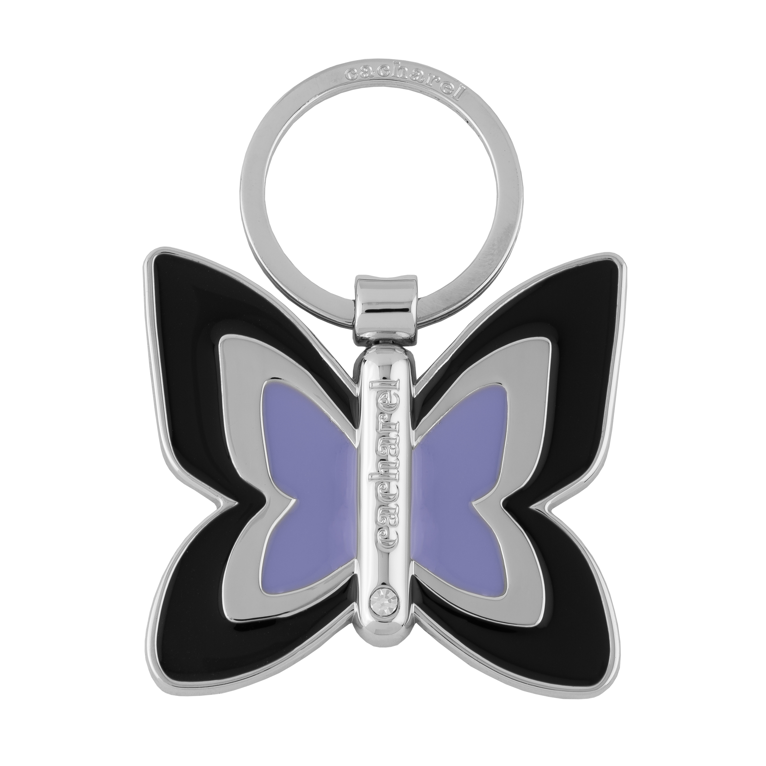 Brelok na klucze Pontia jest delikatny i kobiecy. Zaprojektowany w kształcie motyla, dostępny jest w dwóch różnych kombinacjach kolorystycznych: niebieski z chromowanym wykończeniem i biały ze złotym wykończeniem. Brelok ozdobiony jest cyrkoniami, które dodają kobiecego charakteru. Logo Cacharel jest ładnie wygrawerowane na środku breloczka.