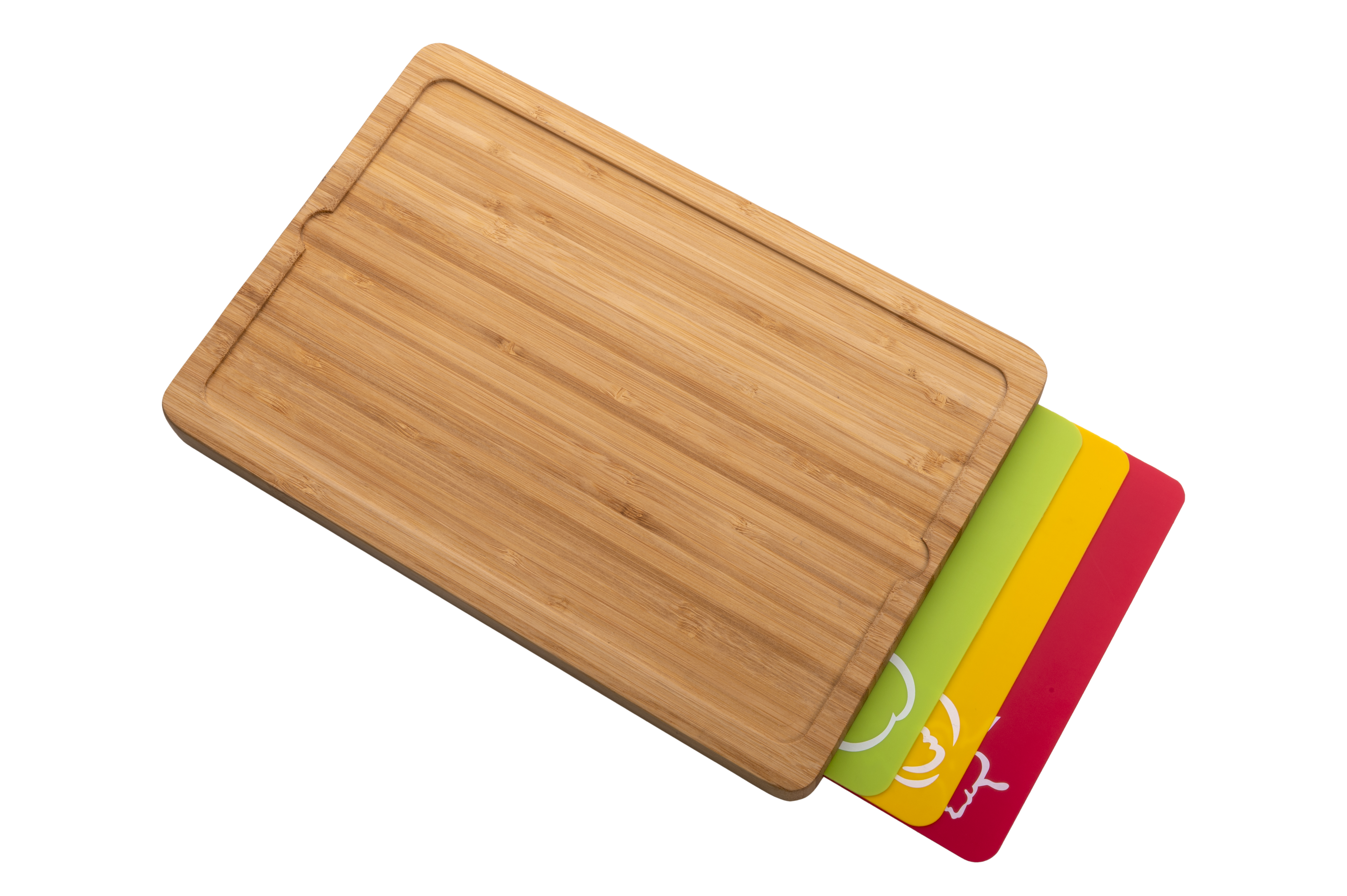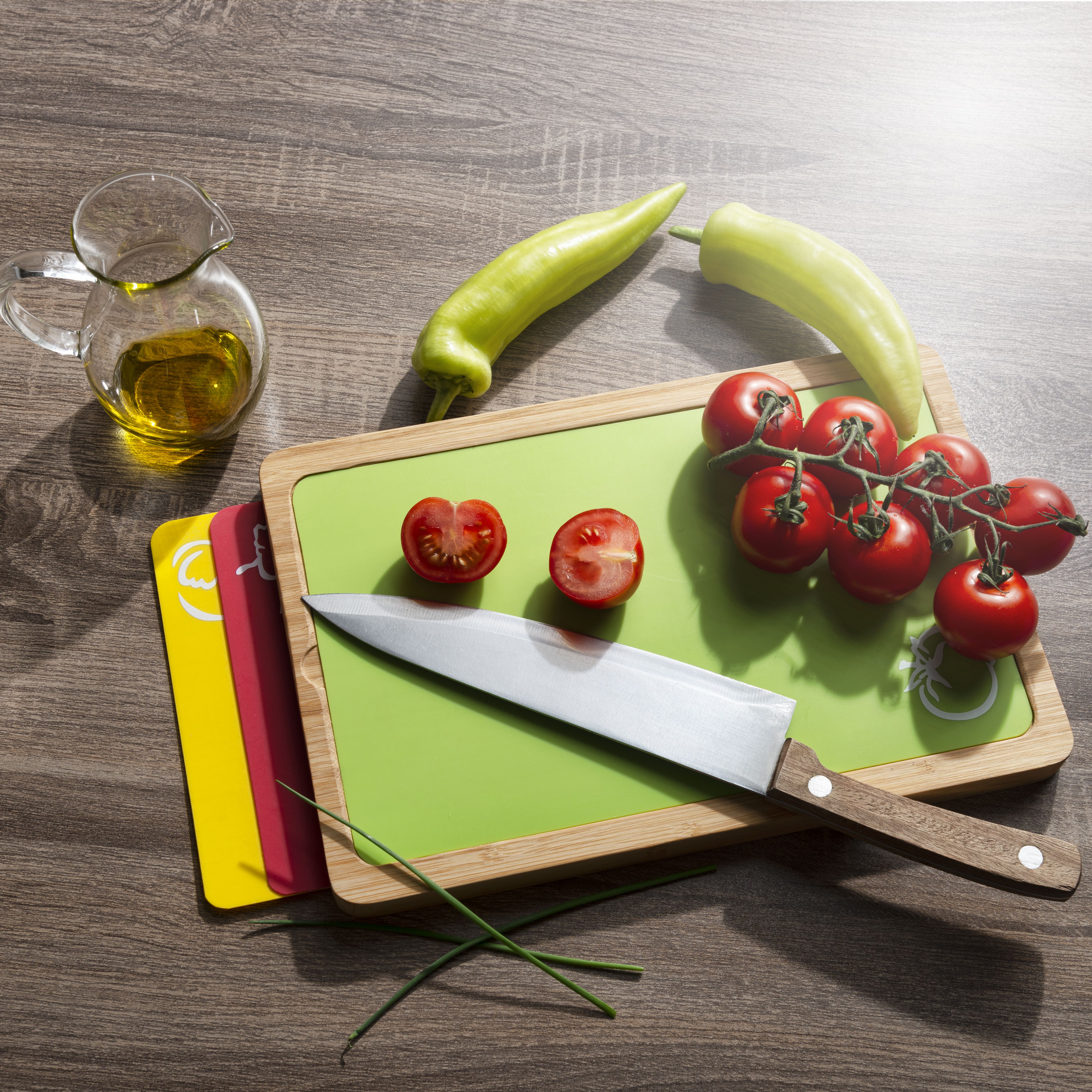 Deska do krojenia Vanilla Season z bambusa, wyposażona w 3 wymienne plastikowe podkładki o różnych kolorach. Kolorowe podkładki są przeznaczone do krojenia różnych rodzajów jedzenia - owoców i warzyw, ciast, mięsa. Wykonane z polipropylenu o wymiarach 27.5 × 17 cm. Zapakowane w prezentowe pudełko Vanilla Season.