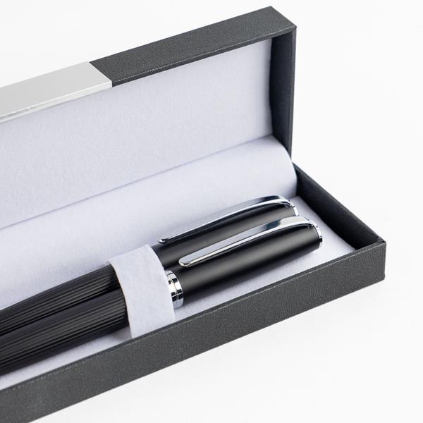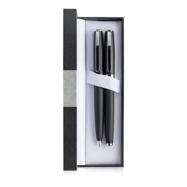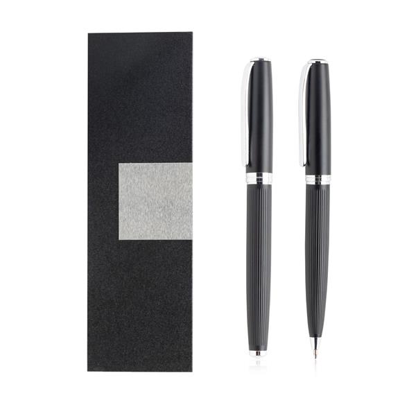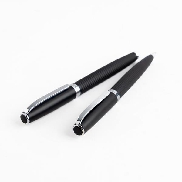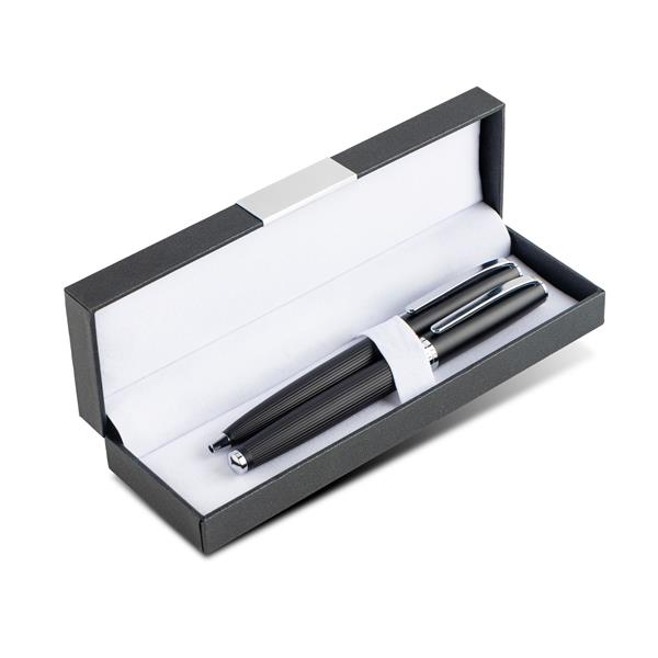 Zestaw pióro oraz długopis w eleganckim pudełku. Ciekawy design tekstury pióra, pudełeczko wyłożone miękka poduszeczką oraz blaszana płytka na zewnątrz nadają świetny wygląd zestawu.