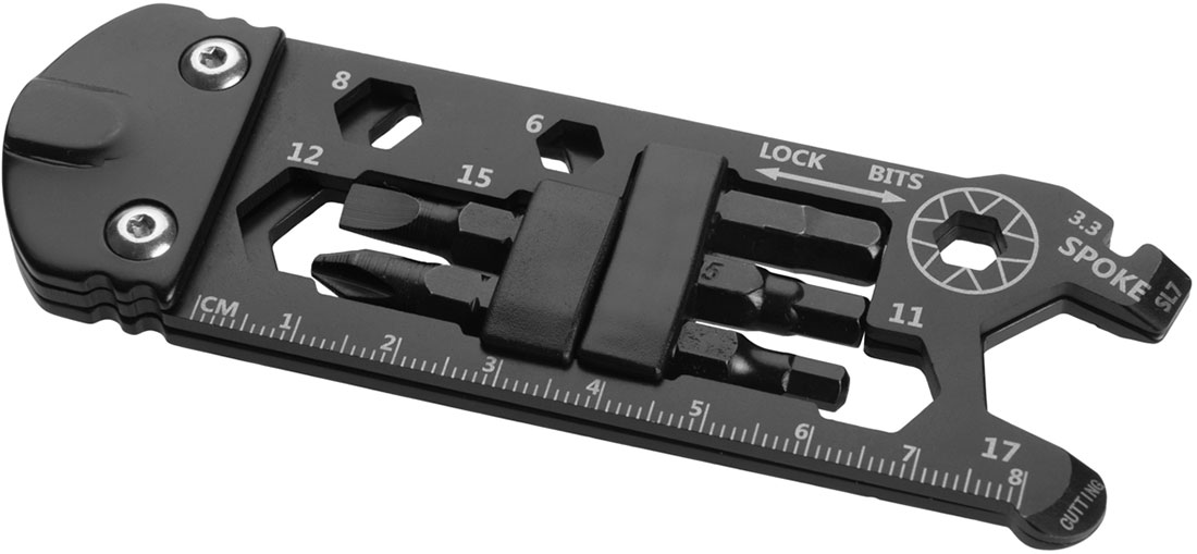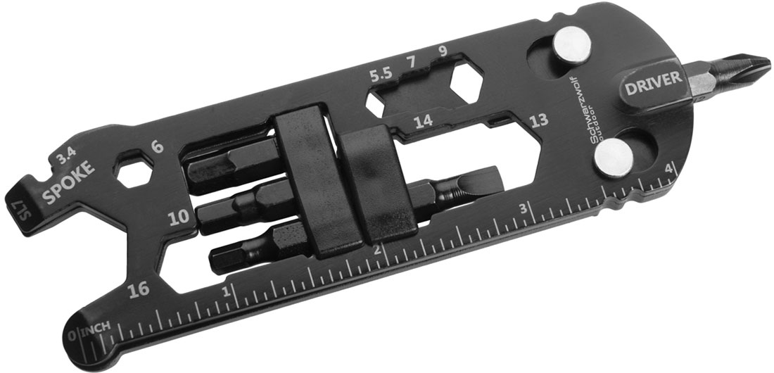 Wielofunkcyjne narzędzie do roweru, wyposażone w 7 różnych narzędzi - klucz do szprych, płaski śrubokręt, śrubokręt philipps, klucz imbusowy 4/5/6mm, klucz imbusowy w romiarze od 3,3 do 18mm, otwieracz do butelek, linijka.