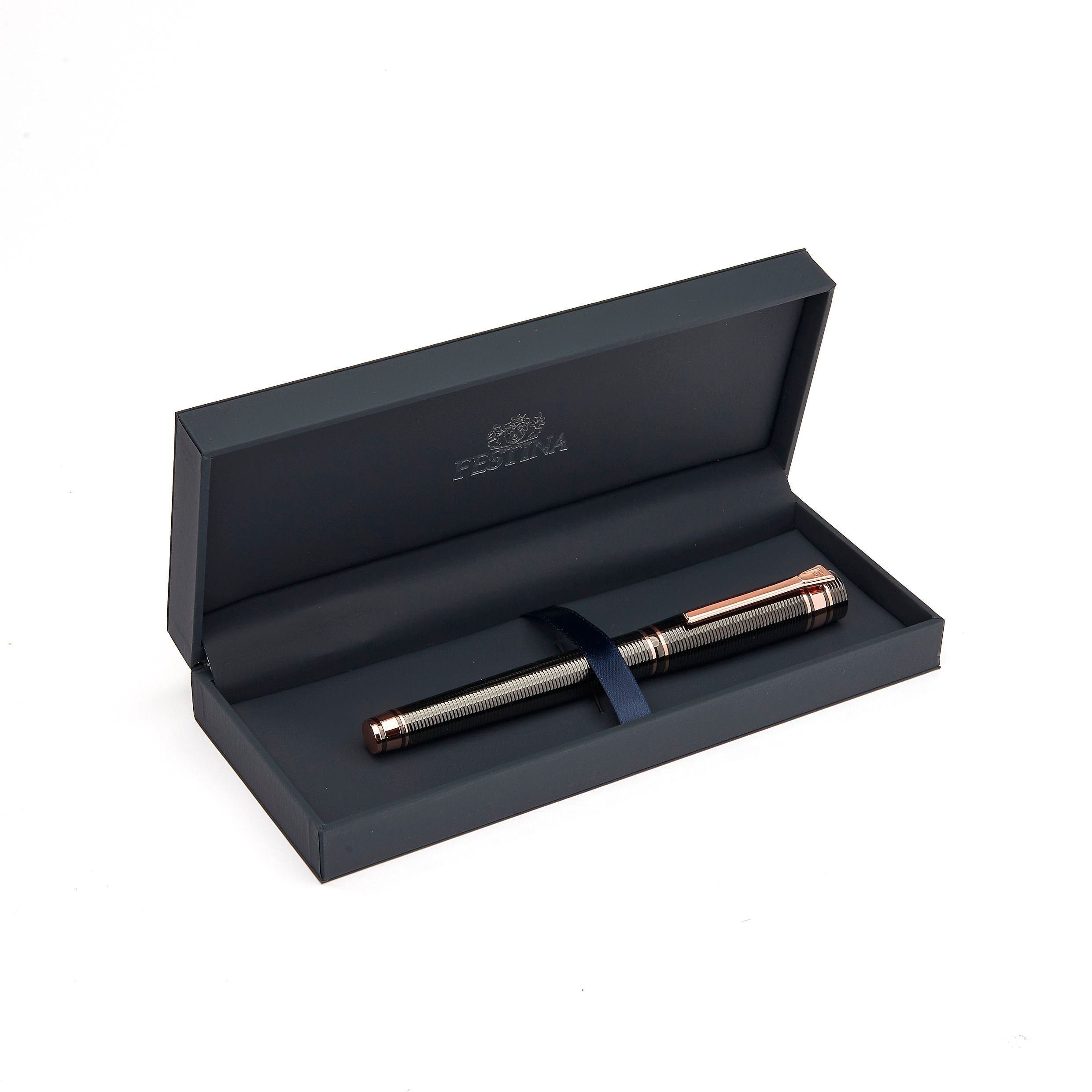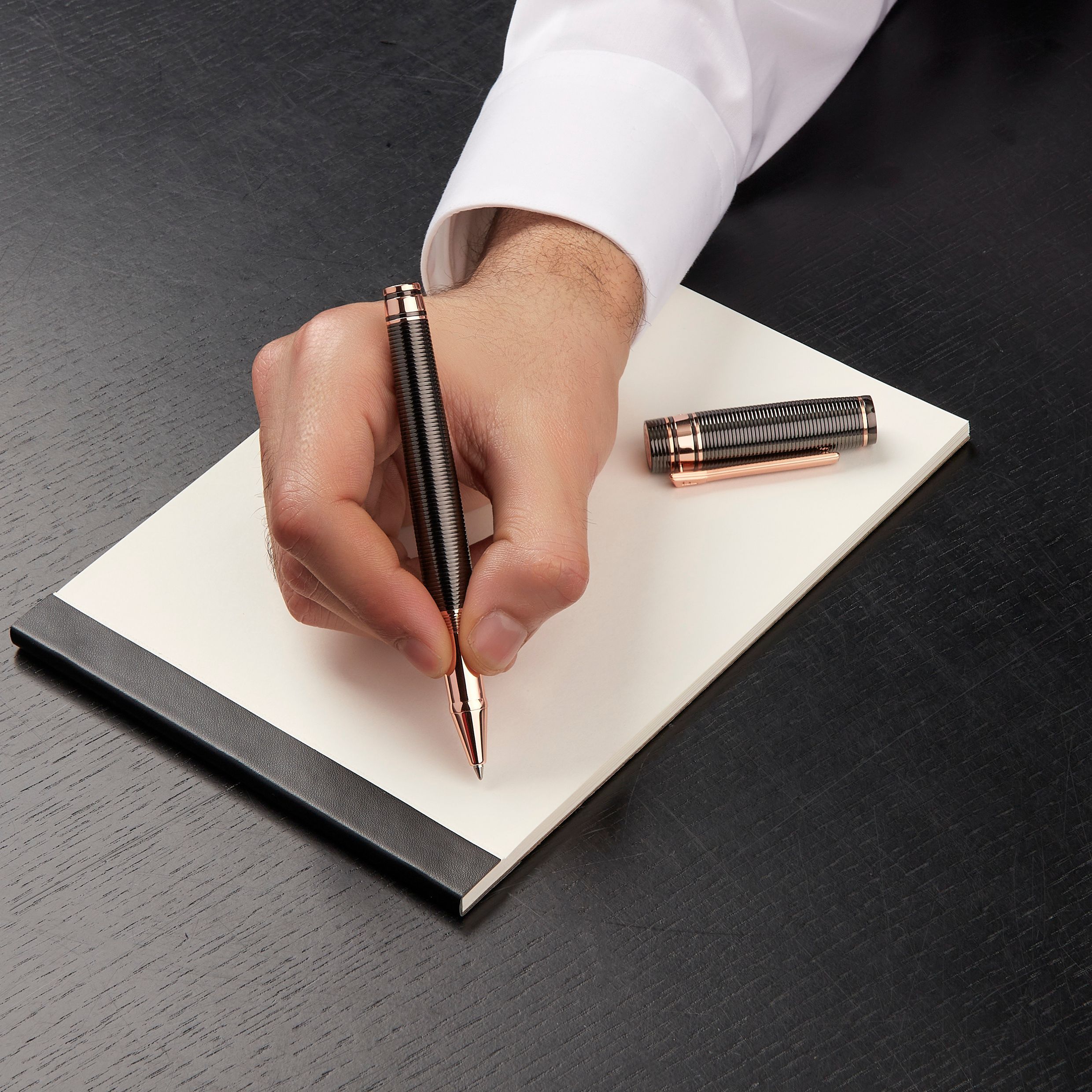 Nieco bardziej nieoczekiwana i wyrafinowana wersja naszej nowej kolekcji artykułów piśmiennych "Bold", ten artykuł piśmienny jest w całości wygrawerowany w poziome paski. Ta część asortymentu jest deklaracją stylu i elegancji sama w sobie i jest oferowana w 3 luksusowych kolorach powłoki metalowej: czarnym, pistoletowym i chromowanym Luksusowym. Gra z kontrastującymi kolorami, wykończeniami i wyrafinowanymi detalami jest kluczem do naszego procesu projektowania. Każdy element subtelnie uzupełnia inny, dając efekt, który jest zarówno elegancki, jak i niewymuszony.