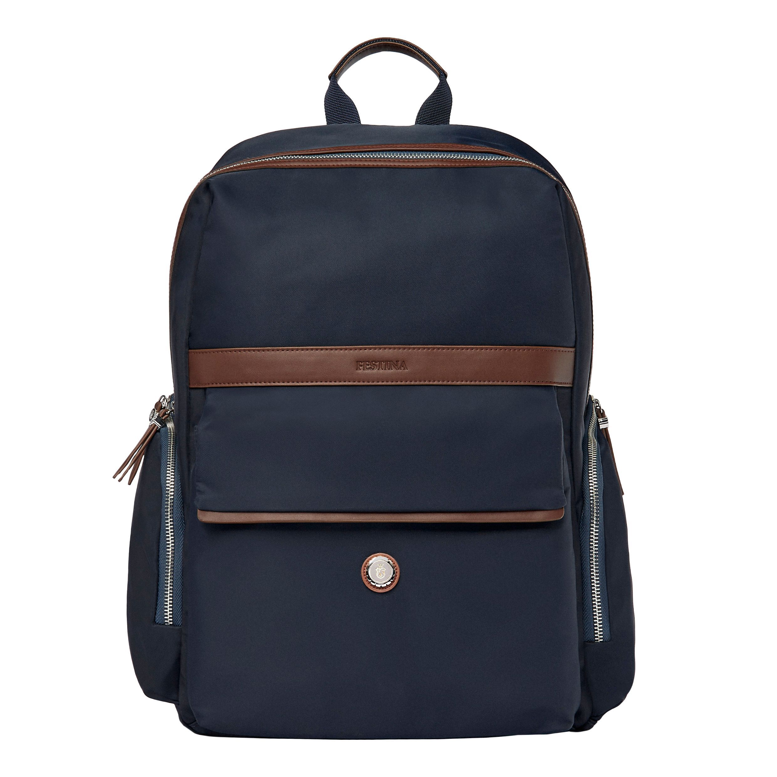 Torba "Festina" Button jest wykonana z gładkiego nylonu z teksturowanymi wykończeniami. Ponadgabarytowa płytka marynarki Button została zapożyczona z naszej tytułowej linii małych skórzanych towarów. Wyraziste chromowane akcenty i luksusowe metalowe i luksusowe metalowe detale nadają jej elegancki wygląd, jednocześnie zachowując ogólnie swobodną estetykę. Linia przycisków jest dostępna w dwóch kolorach: jedna wersja jest całkowicie czarna z emaliowaną tabliczką z podpisem, podczas gdy druga wersja łączy granatowy nylon z brązową wegańską skórą i wyrazistymi chromowanymi wykończeniami. Obie wersje charakteryzują się swobodną elegancją i są łatwe do łączenia i dopasowywania. Nasze logo Festina jest delikatnie wytłoczone na każdym produkcie, co stanowi subtelny końcowy akcent. Każdy szczegół jest delikatnie wykonany, w tym suwaki, ozdobione Festina Blazon, a także podszewka Festina z monogramem. Nasze plecaki Button zostały zaprojektowane z myślą o funkcjonalności, lekkie i kompaktowe, a jednocześnie bardzo wyrafinowane, z licznymi przegrodami zapinanymi na suwak, aby uporządkować wszystkie codzienne niezbędne rzeczy. Oprócz przedniej kieszeni i dwóch bocznych kieszeni zapinanych na zamek, wnętrze zawiera dedykowaną sekcję na laptopa. Ergonomiczny, wyściełany tył i regulowane paski zostały opracowane z myślą o doskonałym komforcie użytkowania, nawet przy przenoszeniu cięższych ładunków.