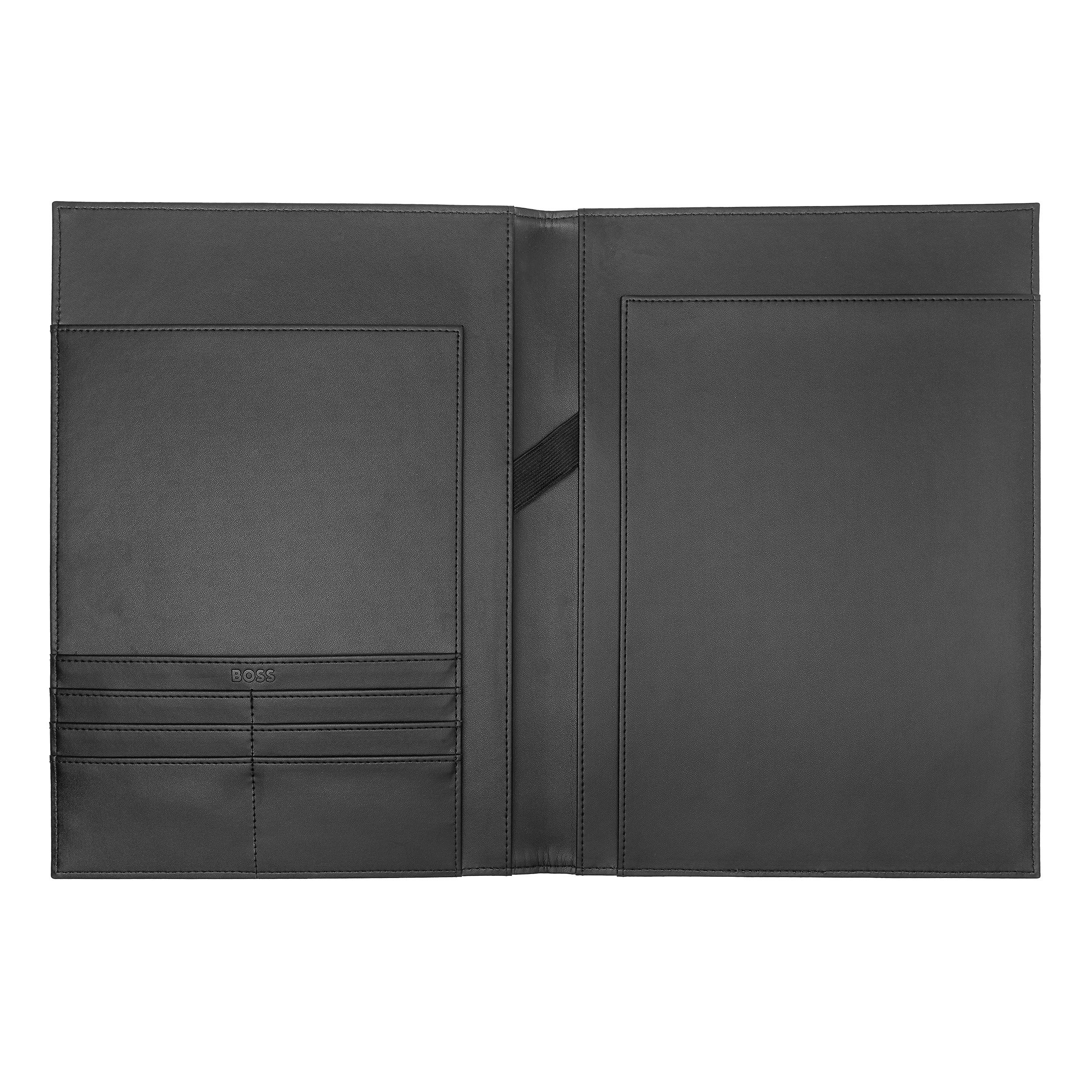 Jednocześnie odważne i dyskretne, nasze teczki z monogramem są wykonane z niestandardowego materiału, delikatnie wytłoczonego kultowym wzorem BOSS. Podpisana tabliczką BOSS luksusowo wykończoną ciemnym chromem, teczka ta stanowi idealnie dopasowany zestaw z długopisami z naszej kolekcji przyborów do pisania. Dostępne w formatach A4 i A5.