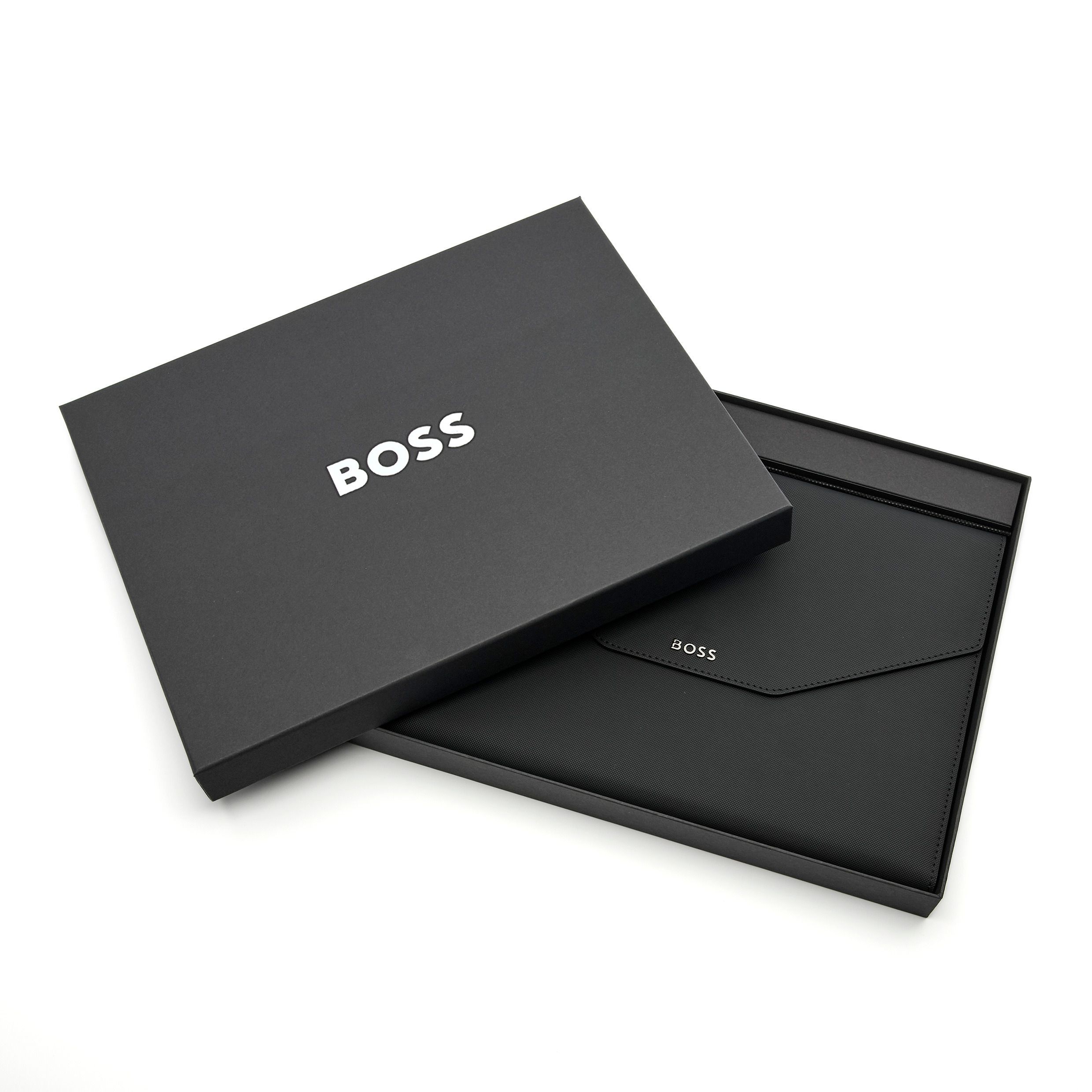Ten minimalistyczny nowy produkt, folder "Rive", został zbudowany w oparciu o uproszczony projekt envellope. Jest nowoczesna dzięki fakturze w kratkę i luksusowa dzięki sygnaturze pistoletu BOSS. Niezwykle proste, eleganckie i współczesne akcesorium do pisania, które można łatwo dopasować do całej kolekcji. Dostępny w formatach A4 i A5.