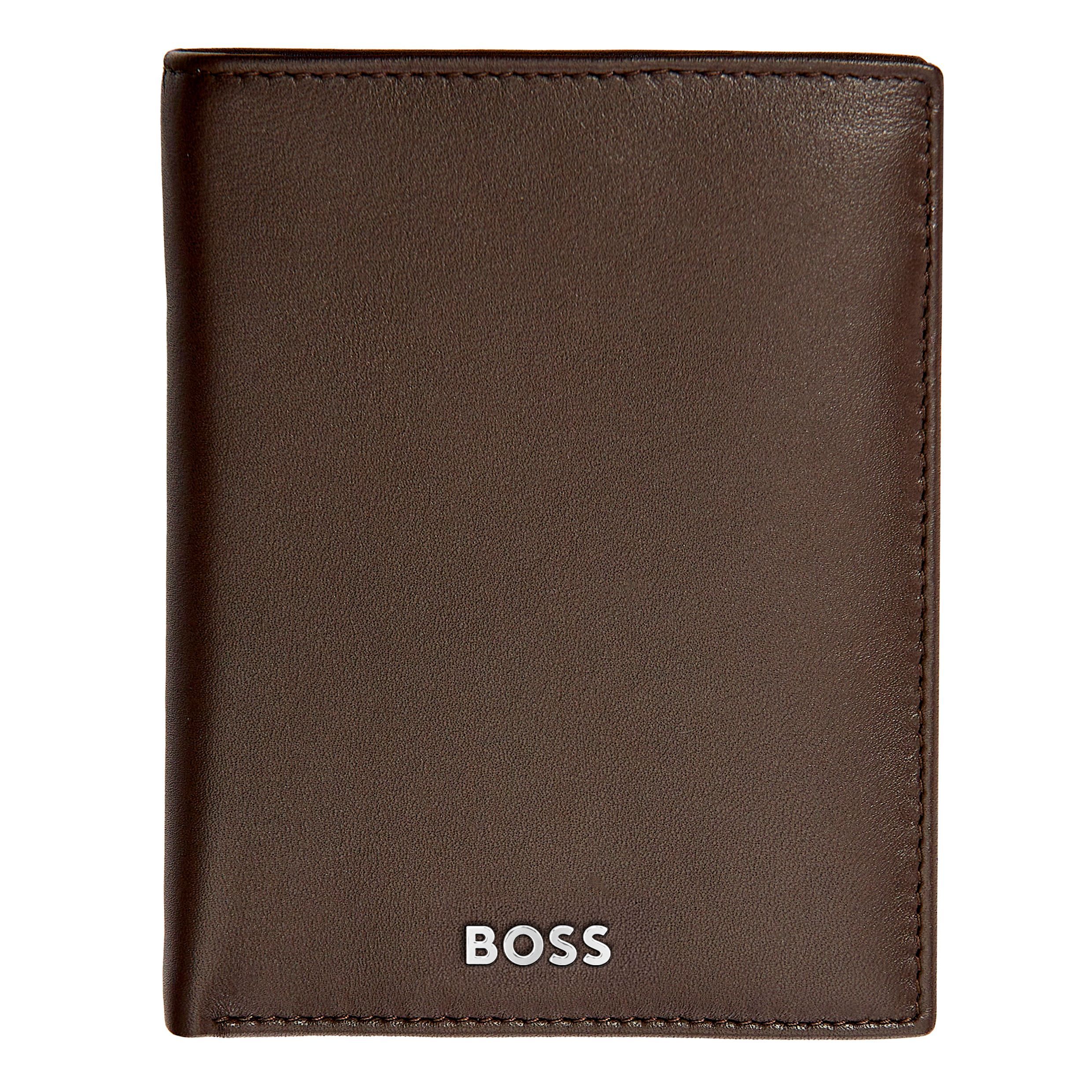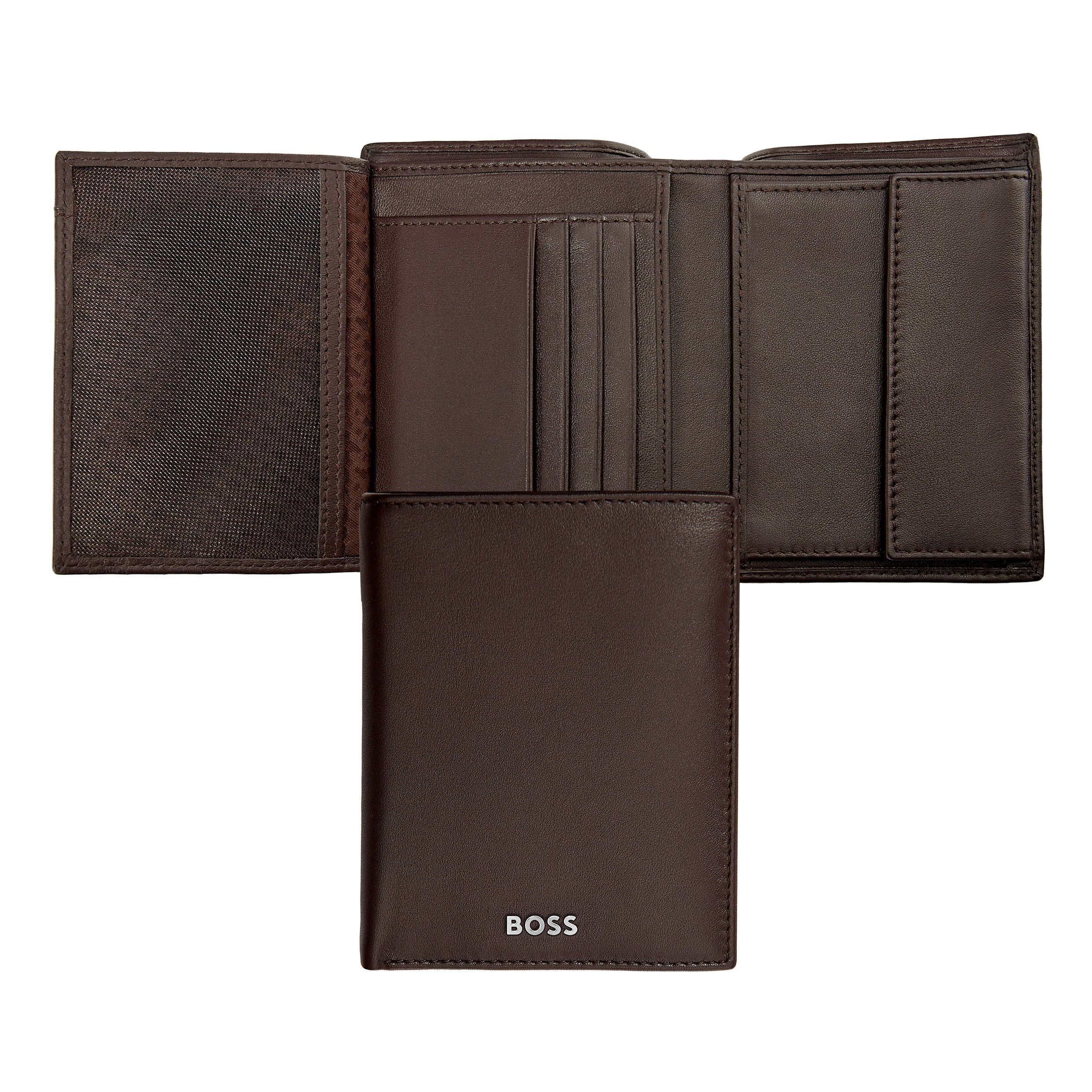Ten pionowy portfel z klapką i kieszenią na monety jest wykonany ze starannie dobranej, brązowej, gładkiej skóry. Jest ozdobiony luksusową chromowaną tabliczką z podpisem BOSS i posiada wewnętrzną podszewkę z monogramem. Portfel zawiera: 2 przegrody na waluty 8 miejsc na karty 5 przegródek bocznych 1 miejsce na monety Zgodnie z DNA marki BOSS, jest prosty, funkcjonalny, elegancki i minimalistyczny.