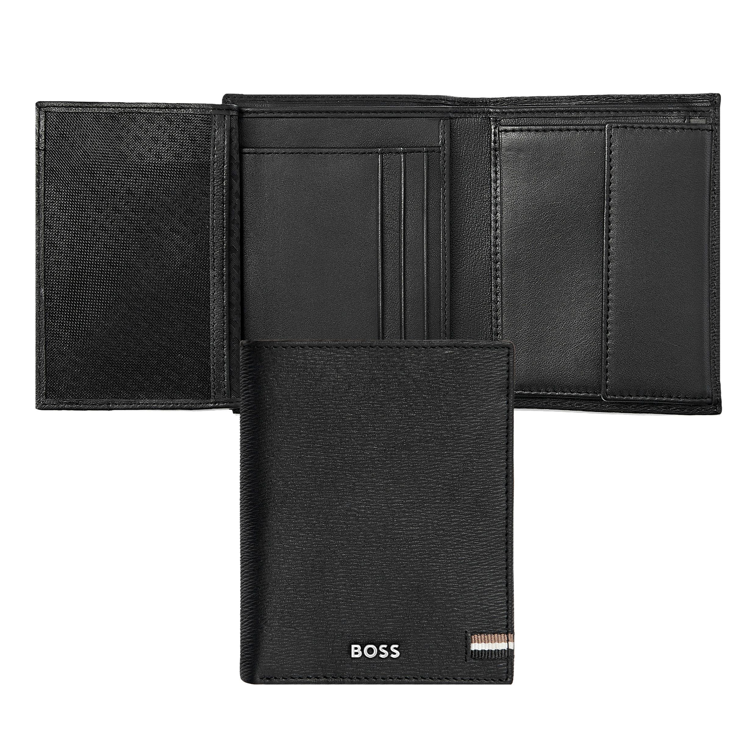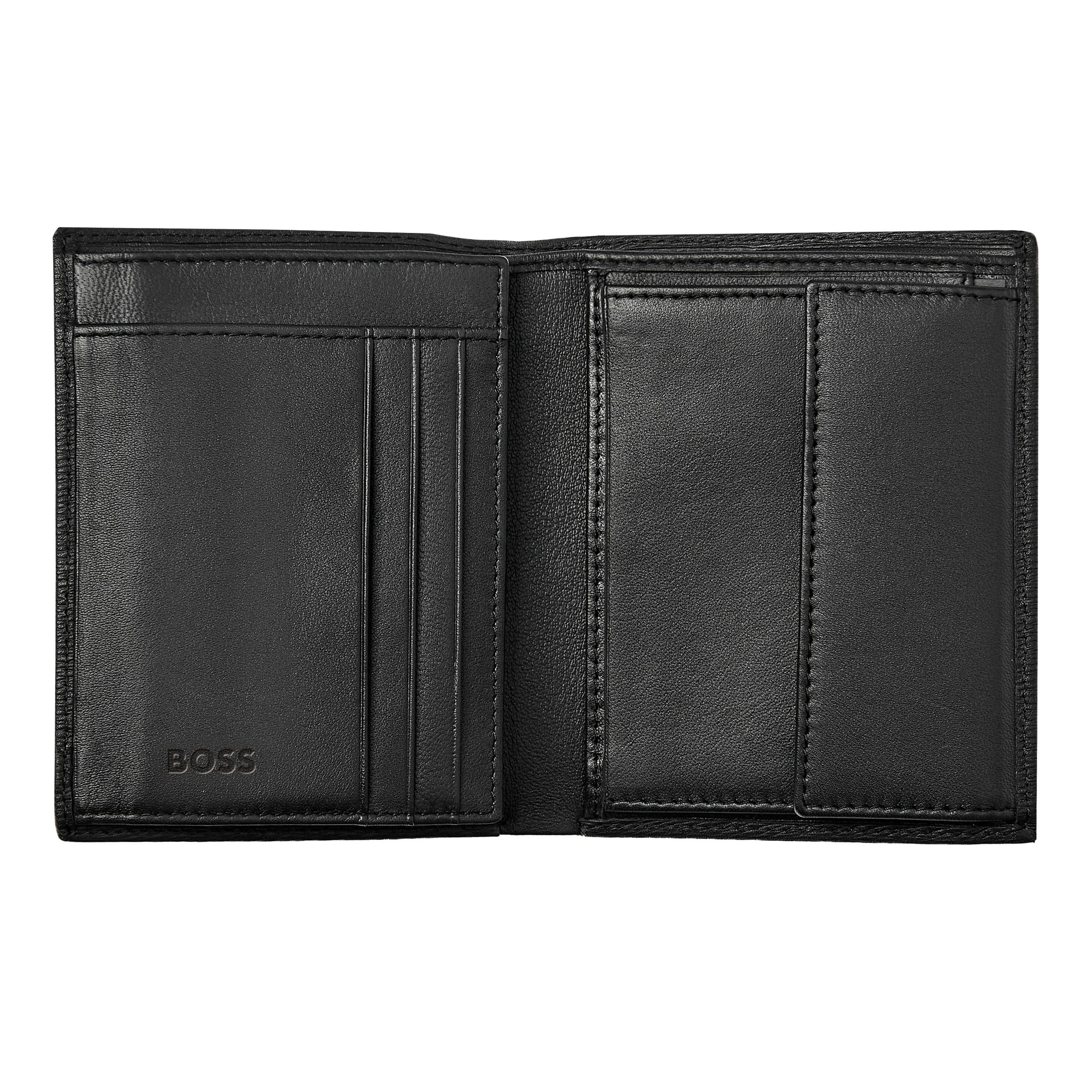 Ten pionowy portfel z klapką i kieszenią na monety jest wykonany ze starannie dobranej, czarnej, teksturowanej skóry. Jest ozdobiony luksusową chromowaną tabliczką z podpisem BOSS i posiada wewnętrzną podszewkę z monogramem. Inną charakterystyczną cechą tej kultowej wersji jest trójkolorowa flaga tekstylna, która zdobi wszystkie przedmioty z tej serii Portfel zawiera: 2 przegrody na waluty 8 miejsc na karty 5 przegródek bocznych 1 miejsce na monety Zgodnie z DNA marki BOSS, jest prosty, funkcjonalny, elegancki i minimalistyczny.