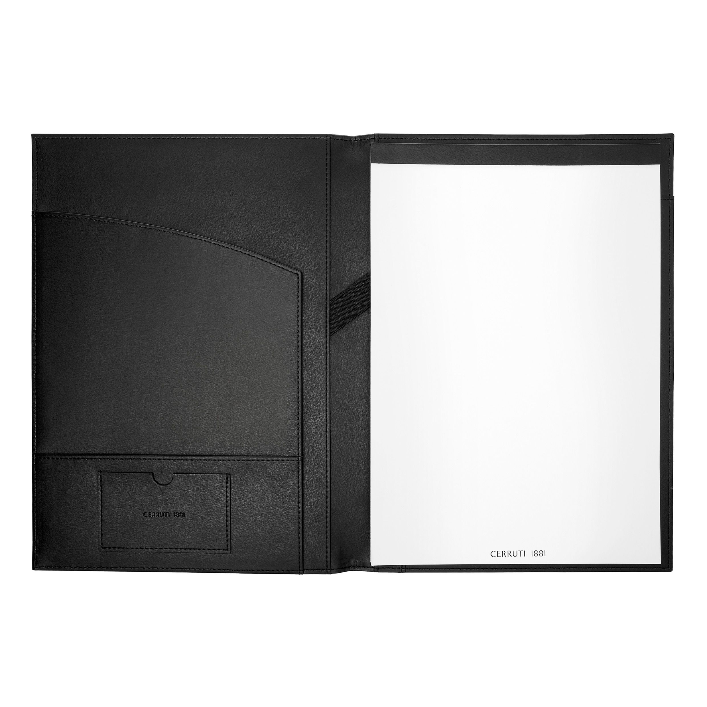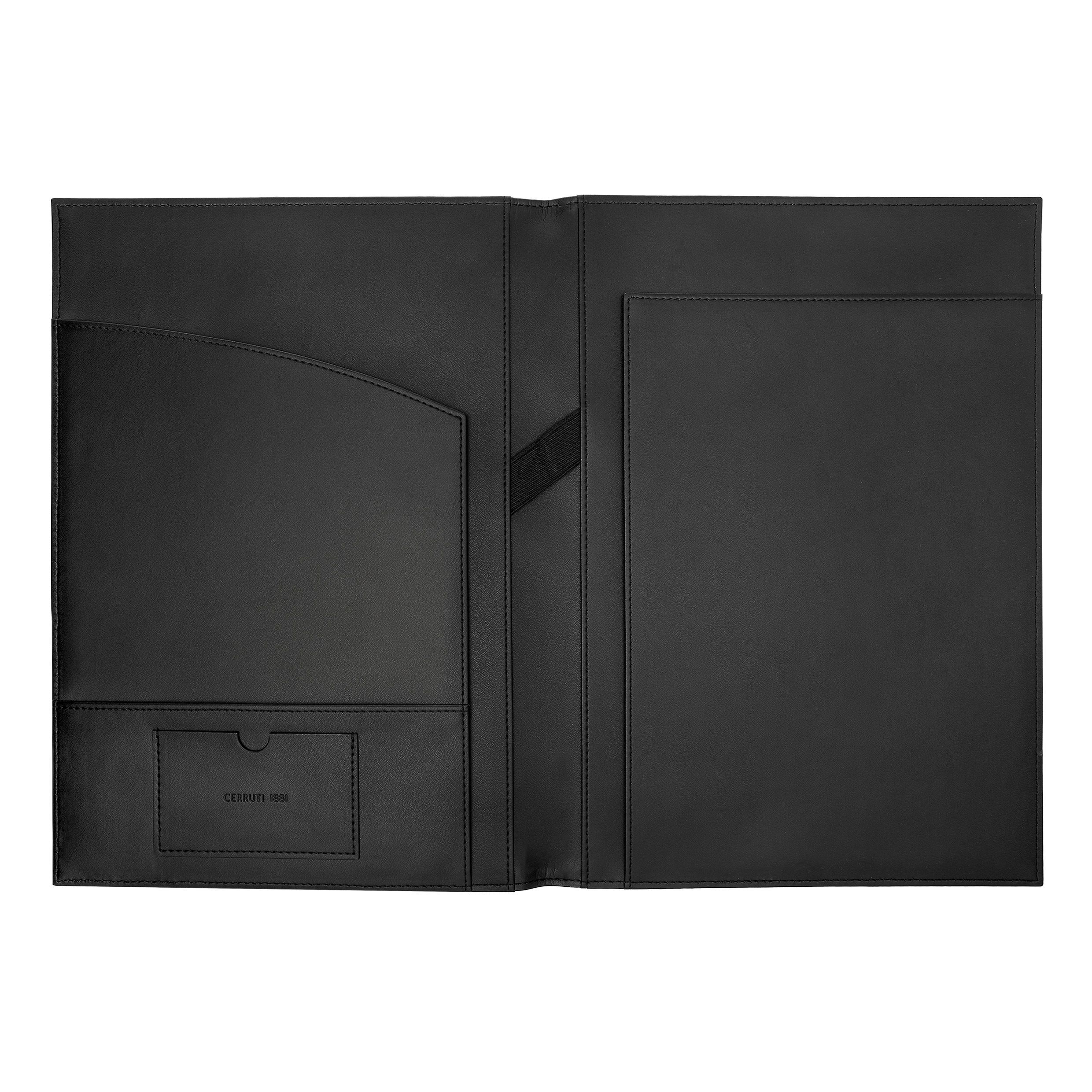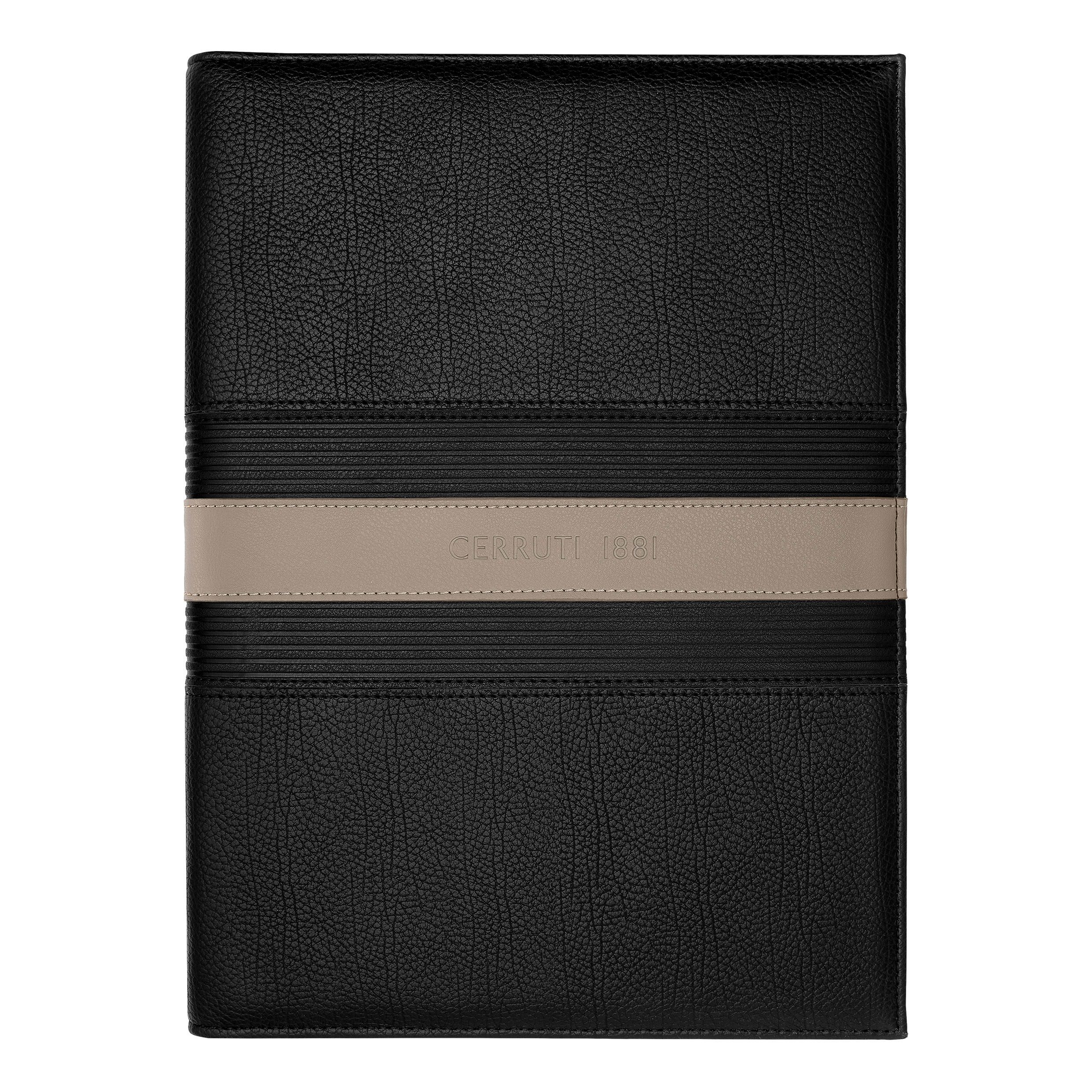 Przedstawiamy teczki do pisania CERRUTI 1881 "Delano", wykonane z wegańskiej skóry w klasycznej czerni z kontrastującym beżowym paskiem i dużym, subtelnie wytłoczonym logo. Te teczki, dostępne w formatach A4 i A5, oferują stylową opcję robienia notatek na spotkaniach lub zapisywania myśli w podróży.