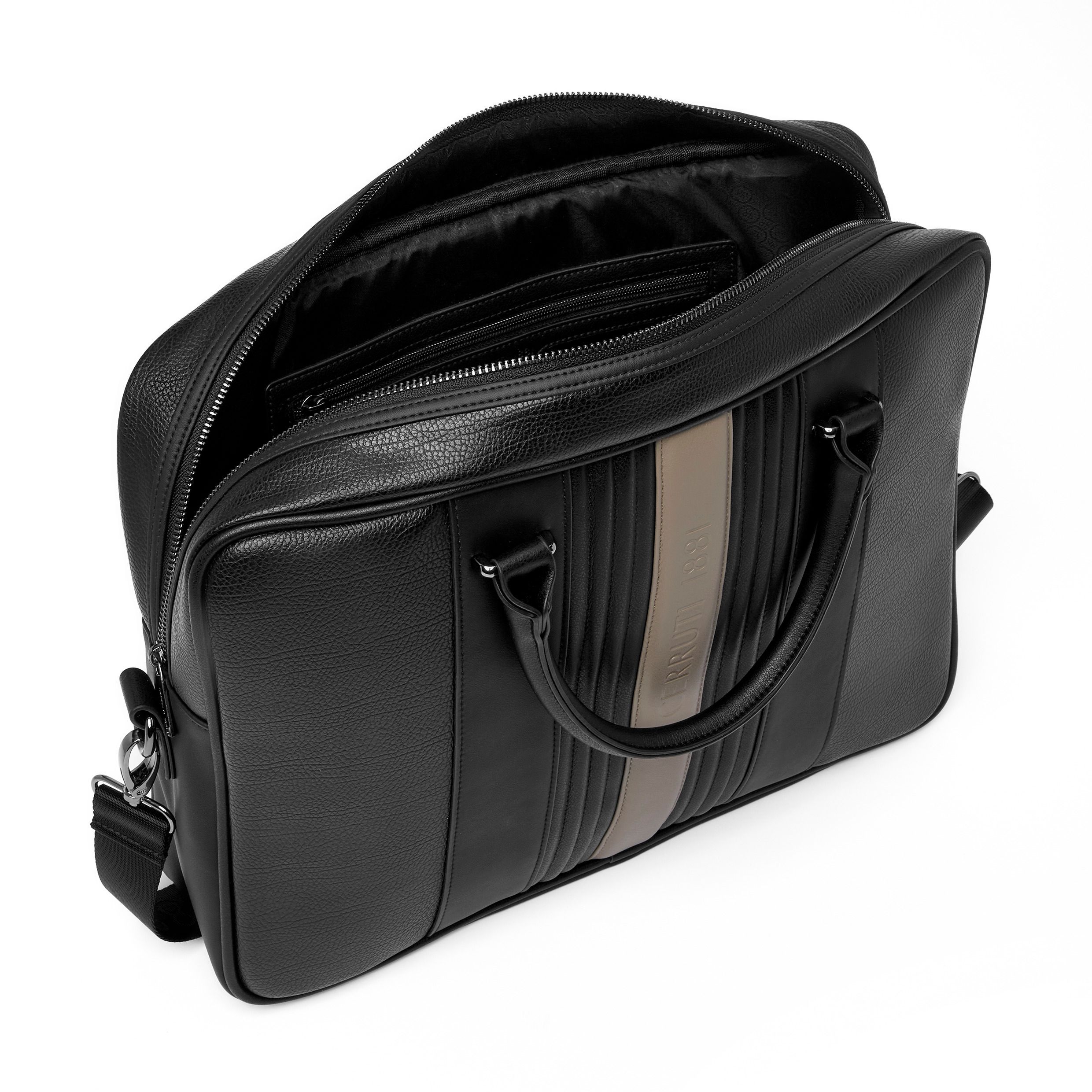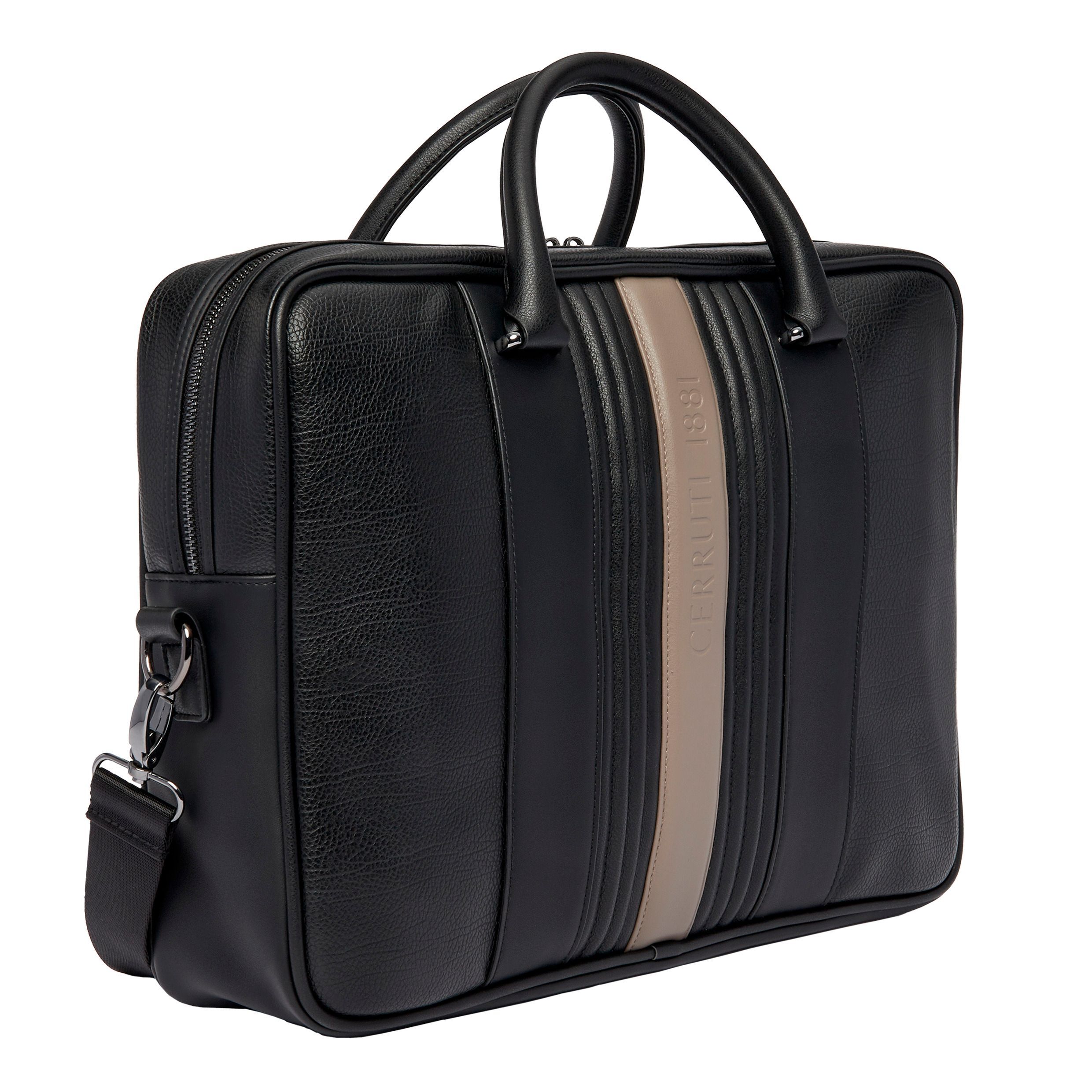 Linia podróżna CERRUTI 1881 "Delano" bawi się kontrastującymi kolorami i teksturami, z pięknie teksturowaną skórą wegańską (PU) obok centralnego beżowego paska z logo luksusowo wytłoczonym logo CERRUTI 1881.