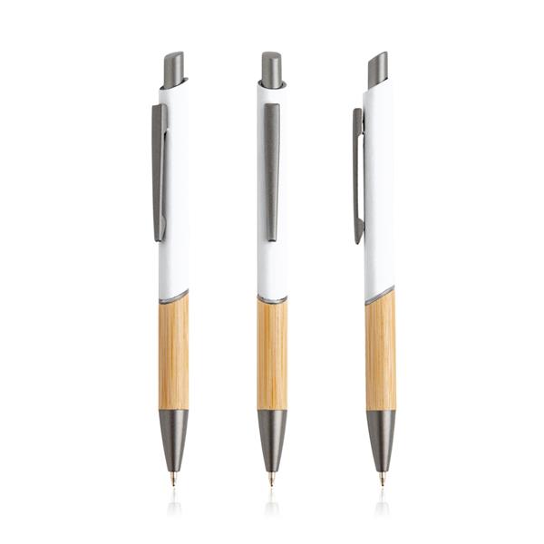 Długopis z recyklingowanego aluminium. Kupując ten długopis, pomagasz zmniejszyć ilość odpadów wynikających z braku ponownego użycia. Ten długopis piszący na niebiesko ma nowoczesny design, łączący recyklingowany metal z gumową powłoką i naturalnym bambusem.