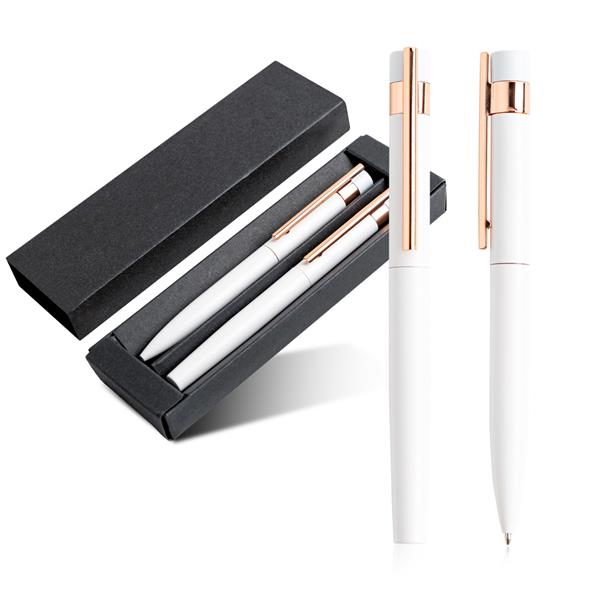 Zestaw piśmienniczy w czarnym kartoniku prezentowym wykończony elementami w kolorze rose gold, idealnie nadaje się do grawerowania. Kolor lasera wychodzi w kolorze różowozłotych detali.